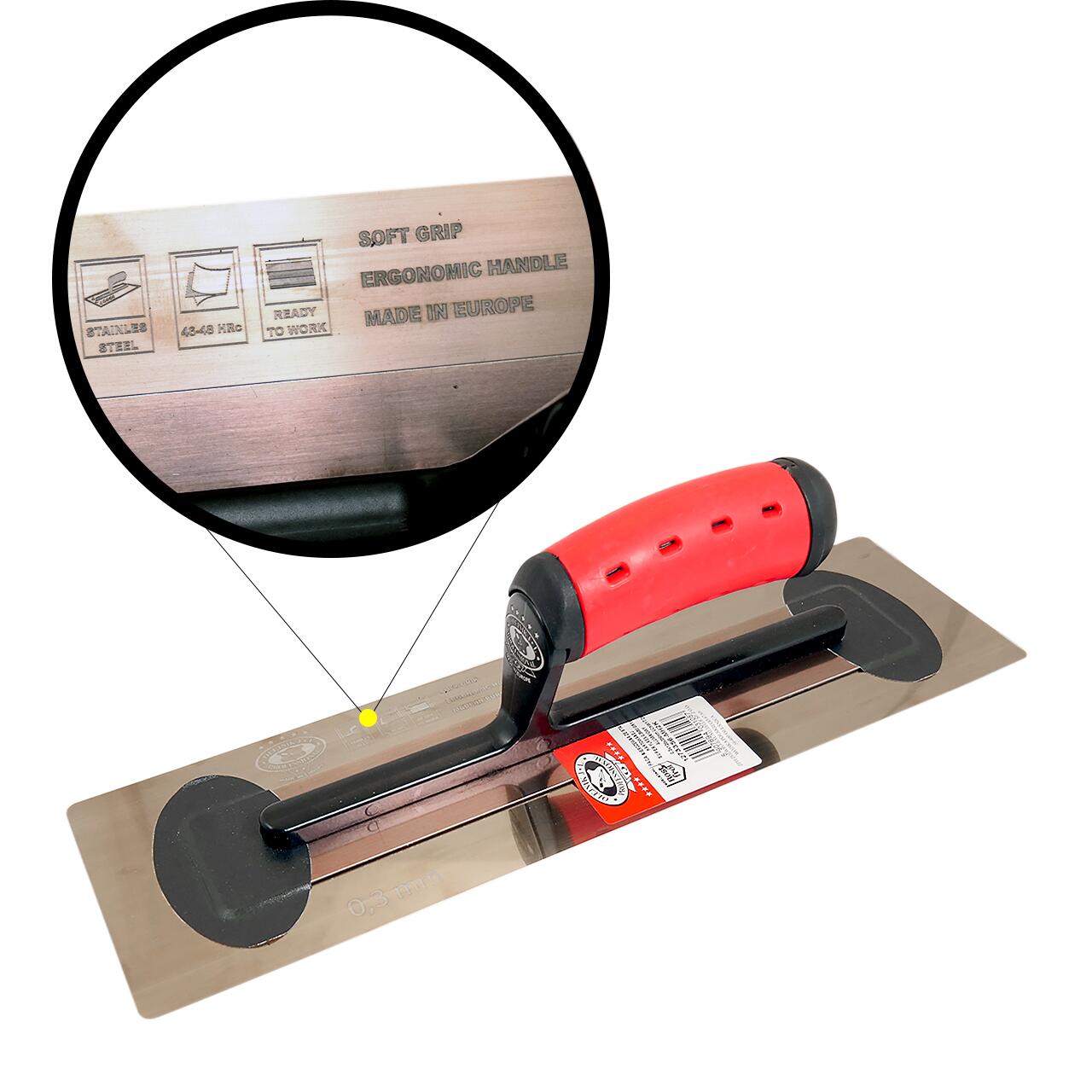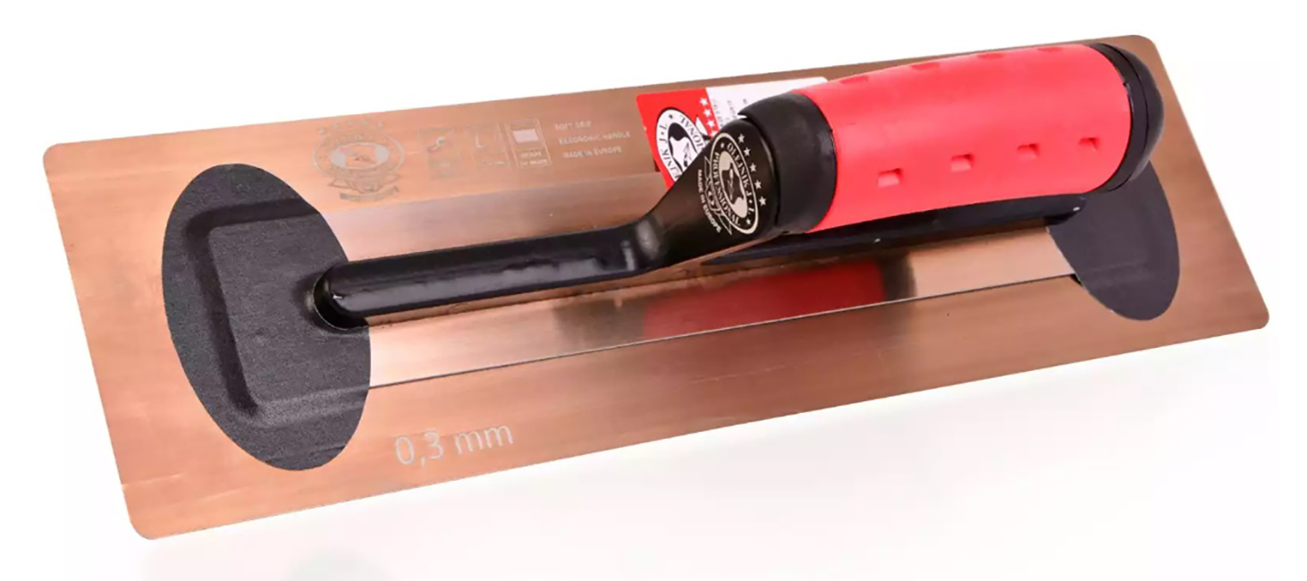 Glettvas acél simító, edzett, 12x35 cm, 0,3 mm, Super Flex, puha nyél, Olejnik