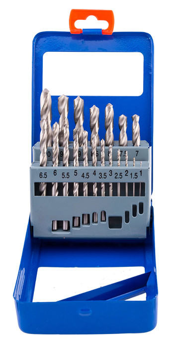 A készletet egy fémdobozba helyezzük, amelyben minden fúrómérethez van kijelölve és kijelölt hely.
