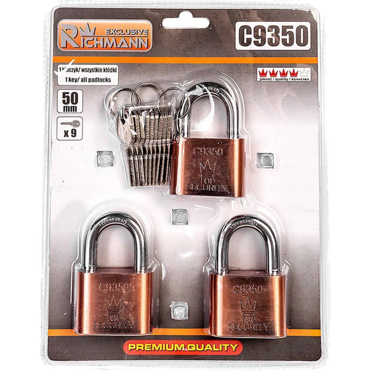 3db 50 mm-es zár készlet azonos kulccsal, RICHMANN EXCLUSIVE Acélból készült, rézbevonatú, fedeles zárak. A készlet 3 kulcskészletet tartalmaz, mindegyikben 3 darab gyűrű van. Band of...