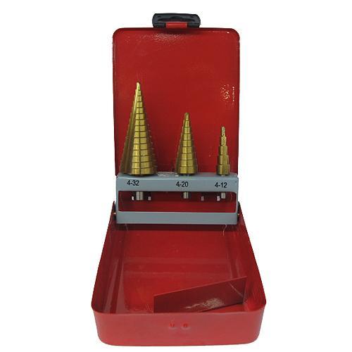 3 db-os fúrókészlet fémhez, lépcsős, titán, 4-12/20/32 mm