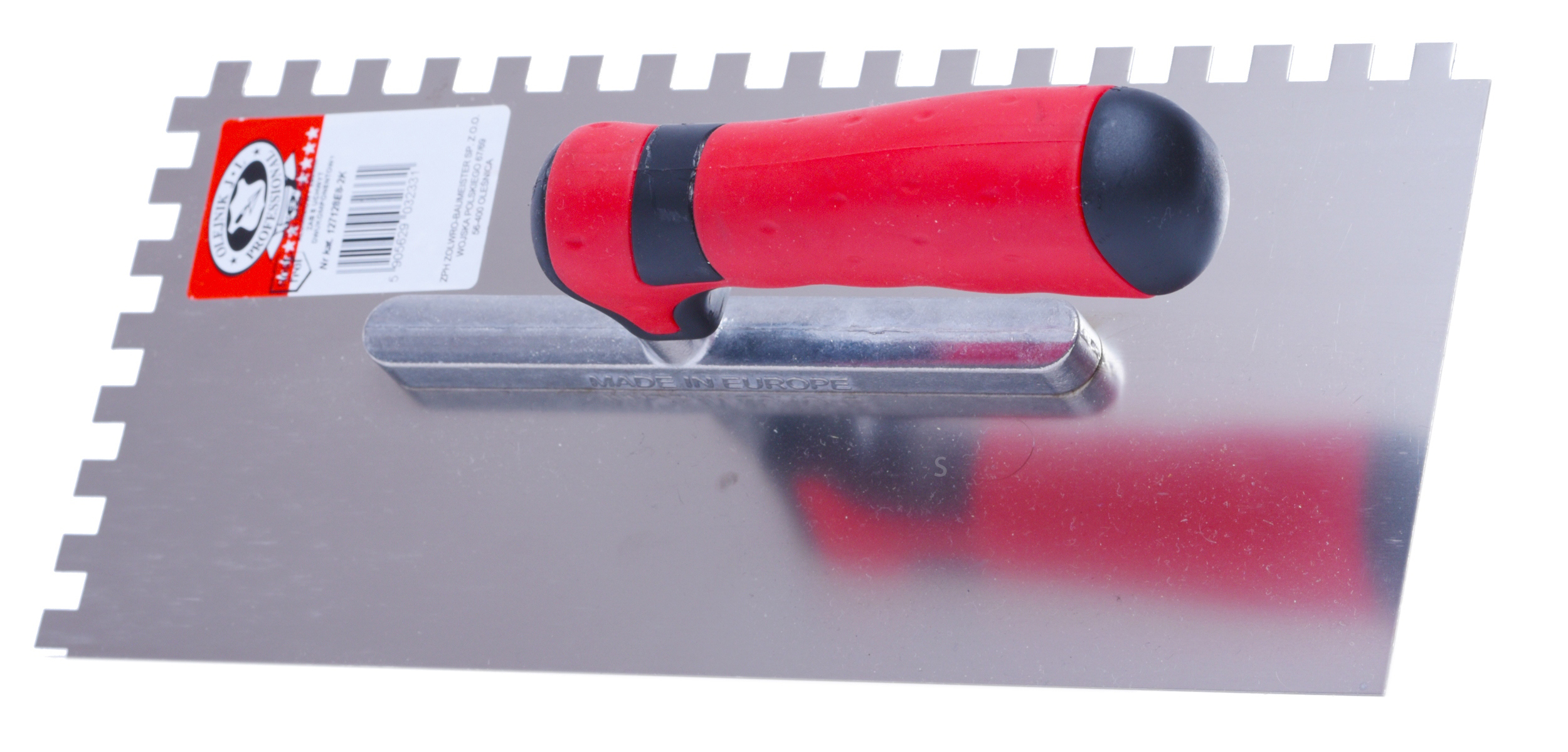 Glettvas acél simító, fogakkal 6x6 mm, puha nyél, 13x28 cm, Piros, Olejnik