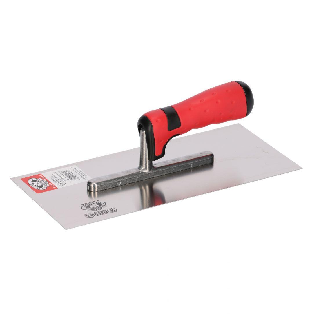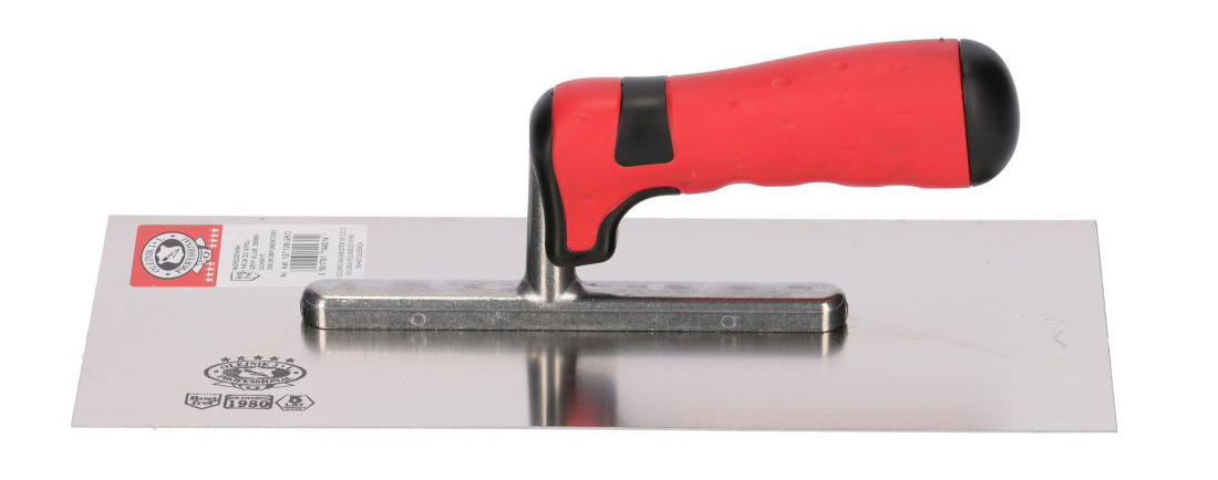 Glettvas acél simító, 13x28 cm, 0,7 mm, puha nyél, piros, Olejnik