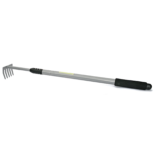 A kerti gereblye acélból készült, és teleszkópos nyéllel rendelkezik, amely akár 105 cm-re is meghosszabbítható.