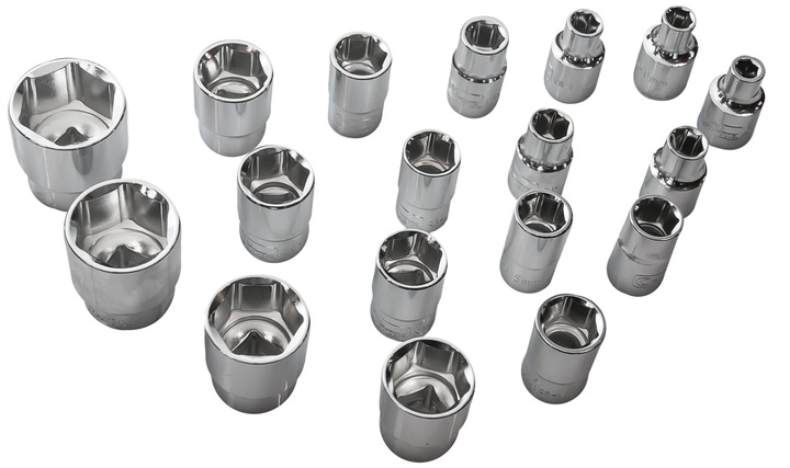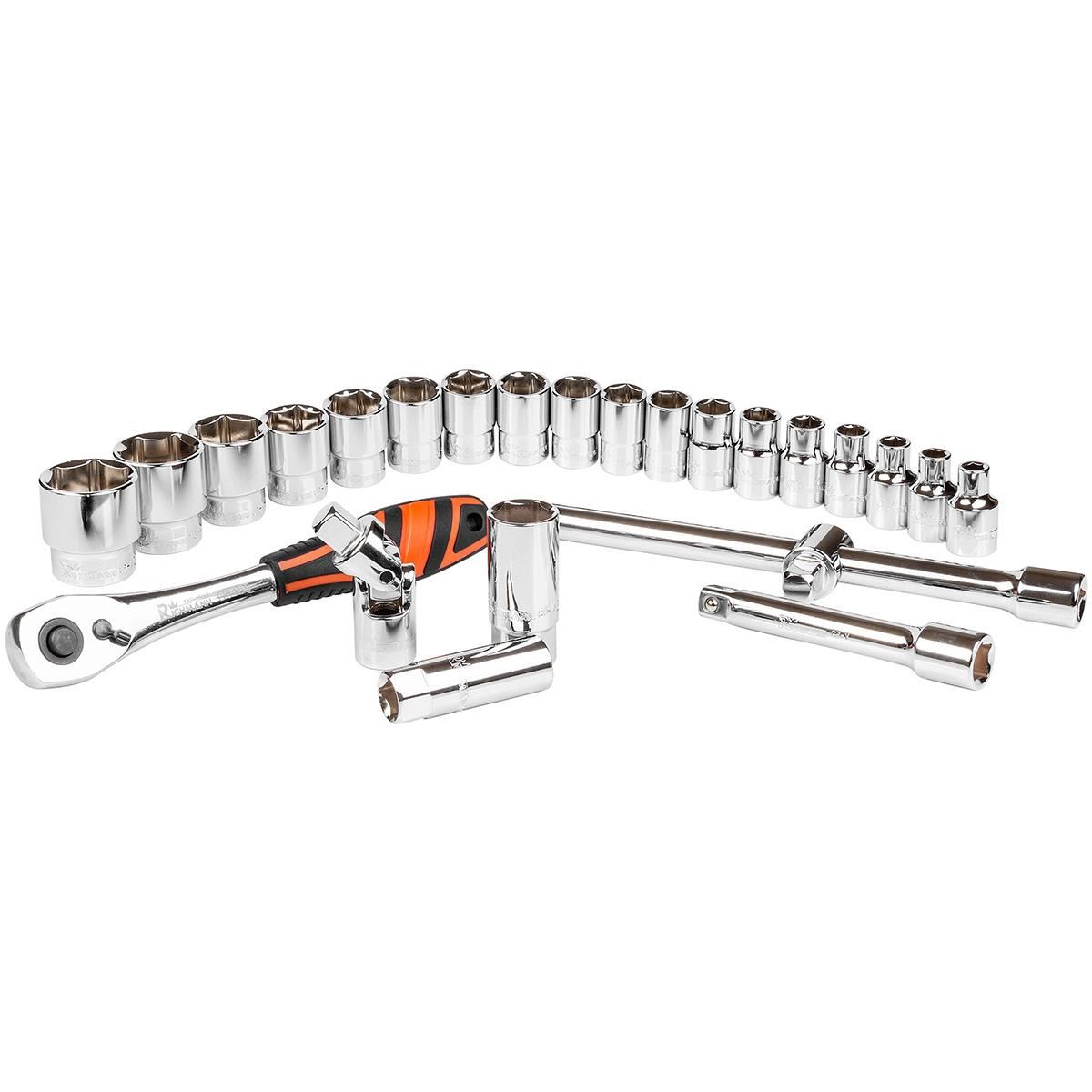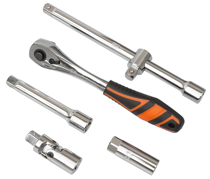 A készlet  -t; rövid csővégeket és racsnis csavarkulcsot, 25 elemekből, kiváló minőségű anyagból, króm-vanádium (Cr-V) acélból, korrózióvédő krómból, polírozott a könnyű tisztításért, profiknak szánt.