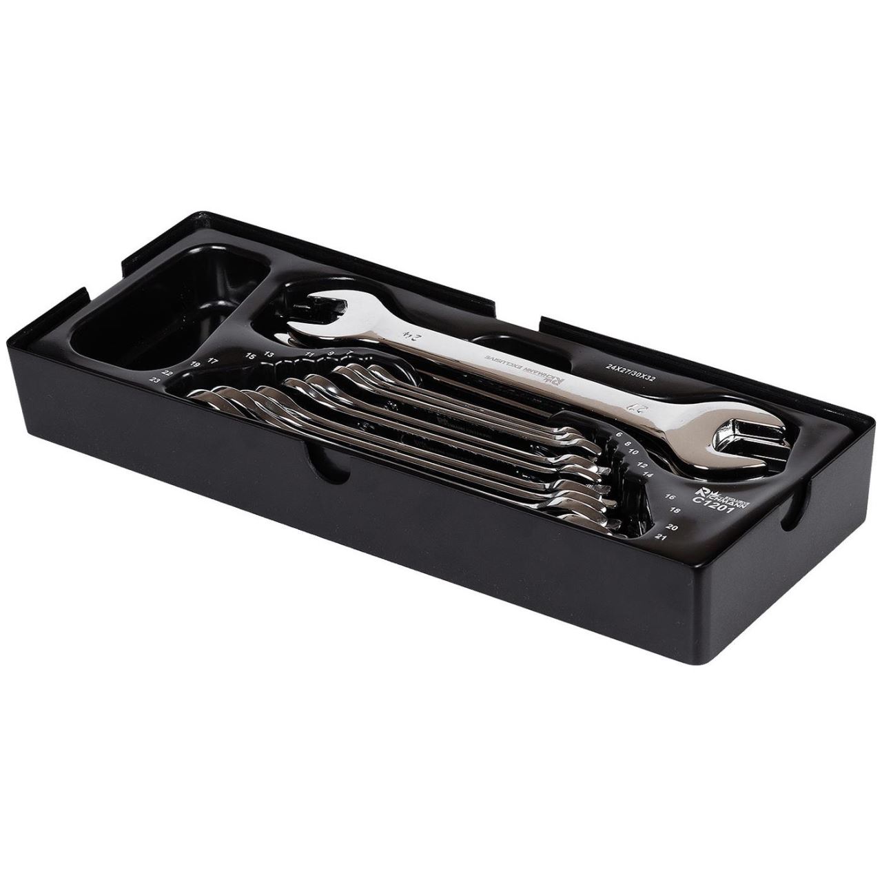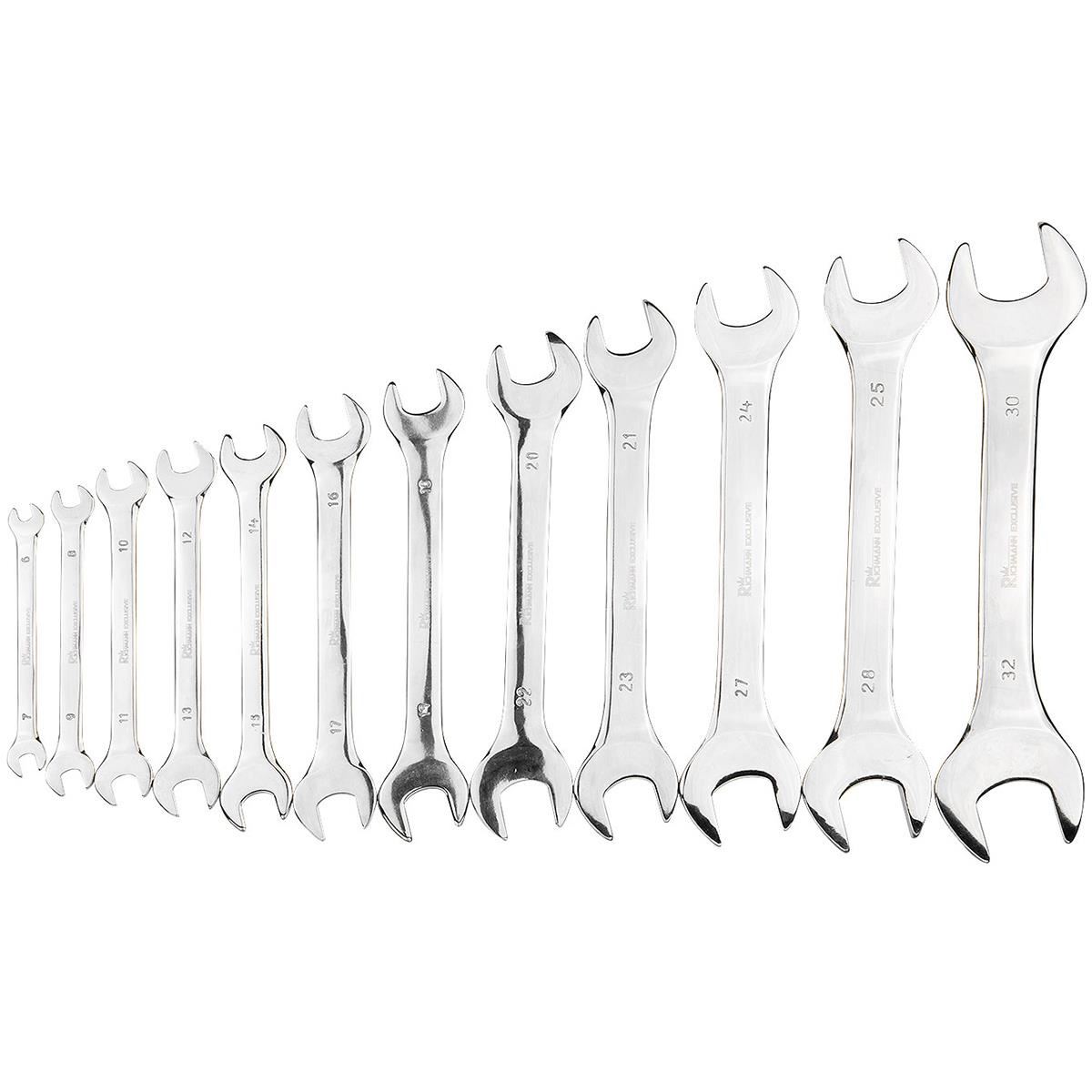 A készlet 12 db kulcsot tartalmaz a következő méretekkel: 6x7, 8x9, 10x11, 12x13, 14x15, 16x17, 18x19, 20x22, 21x23, 24x27, 25x28, 30x32.