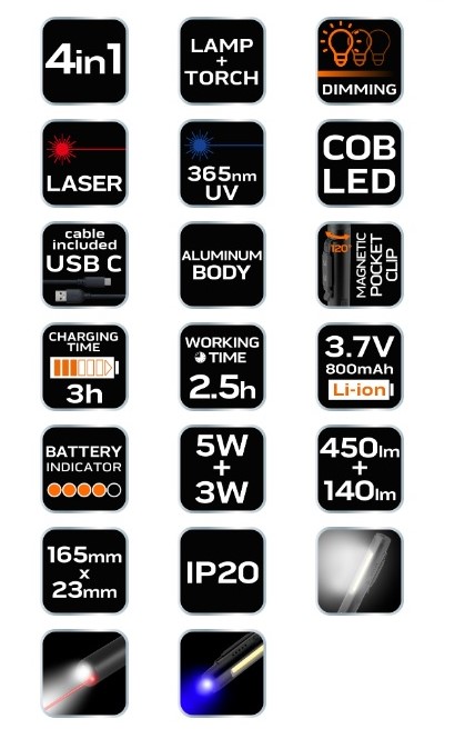 A 450 lm-es fényáramú és COB LED-ekkel rendelkező ellenőrző zseblámpa ezenkívül tartalmaz egy 365 nm-es UV lámpát, lézert és egy 140 lm / 3 W-os zseblámpát.. Ez a 4 az 1-ben multifunkciós készülék 3,7 V-os 800 mAh lítium-ion akkumulátorral rendelkezik.