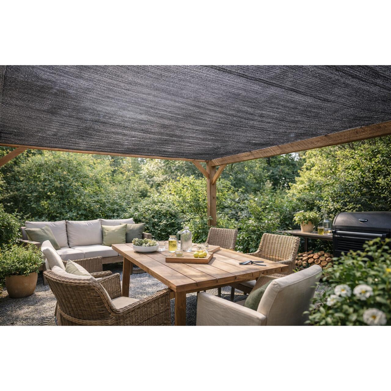 Ez az árnyék háló továbbra is használható az sikeresen teraszokon, pergolákon, kerteken és pázsiton, de hatékonynak bizonyul a nyílt területeken is, ahol bizonyos érzékeny növények védelme kívánatos.