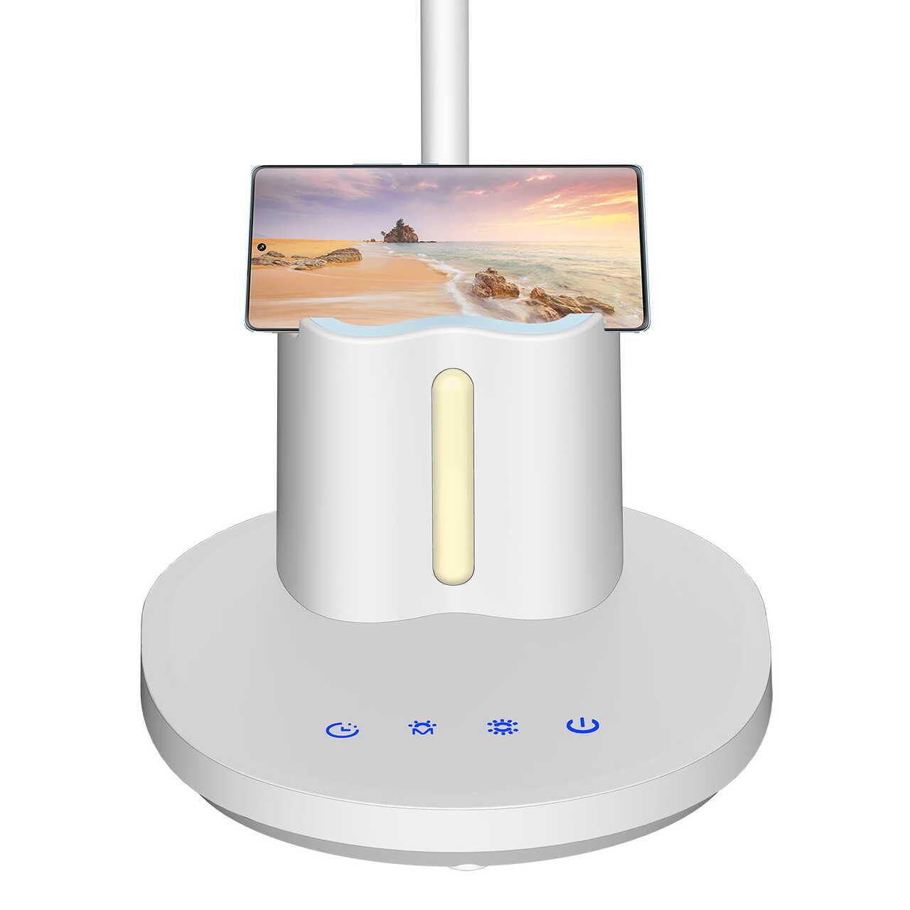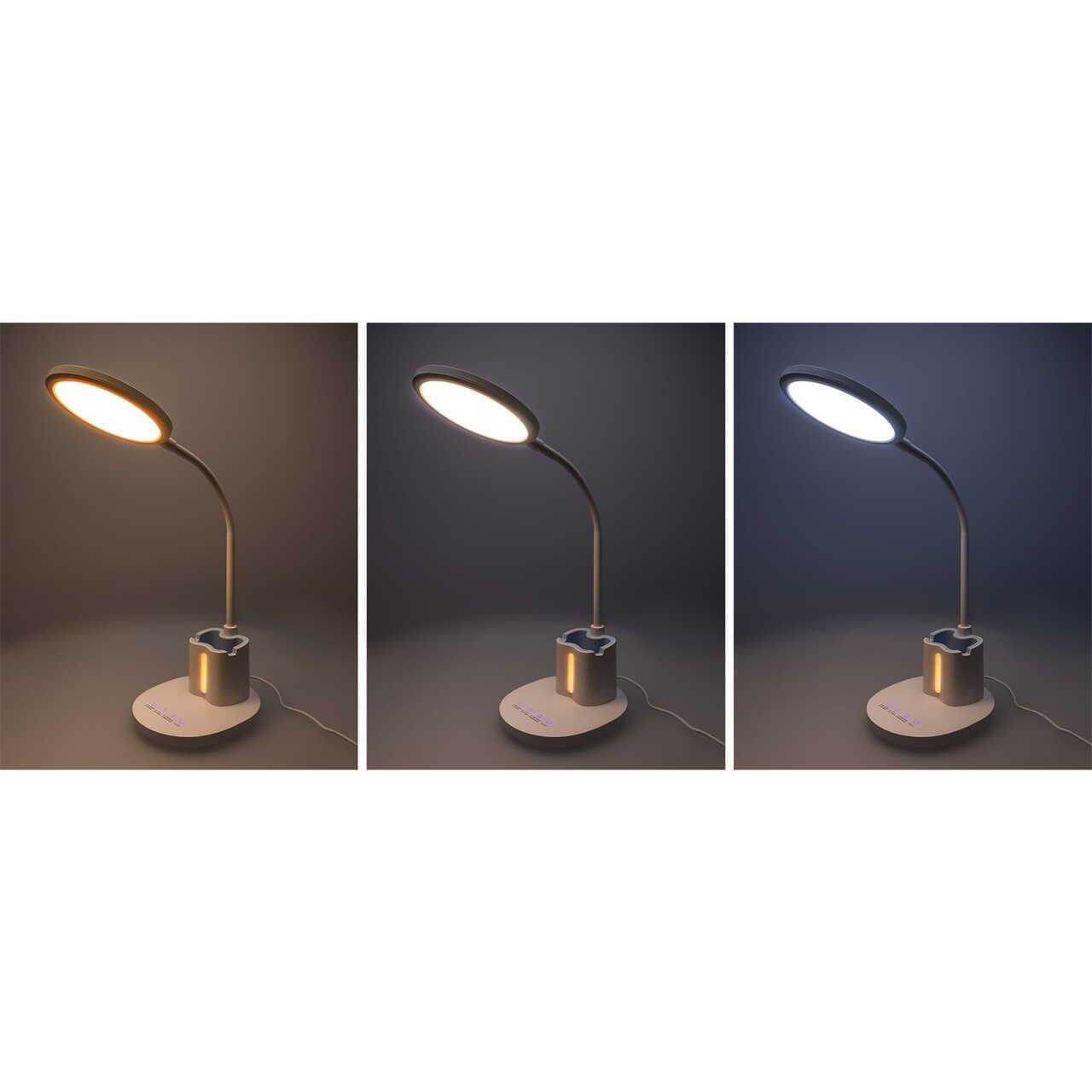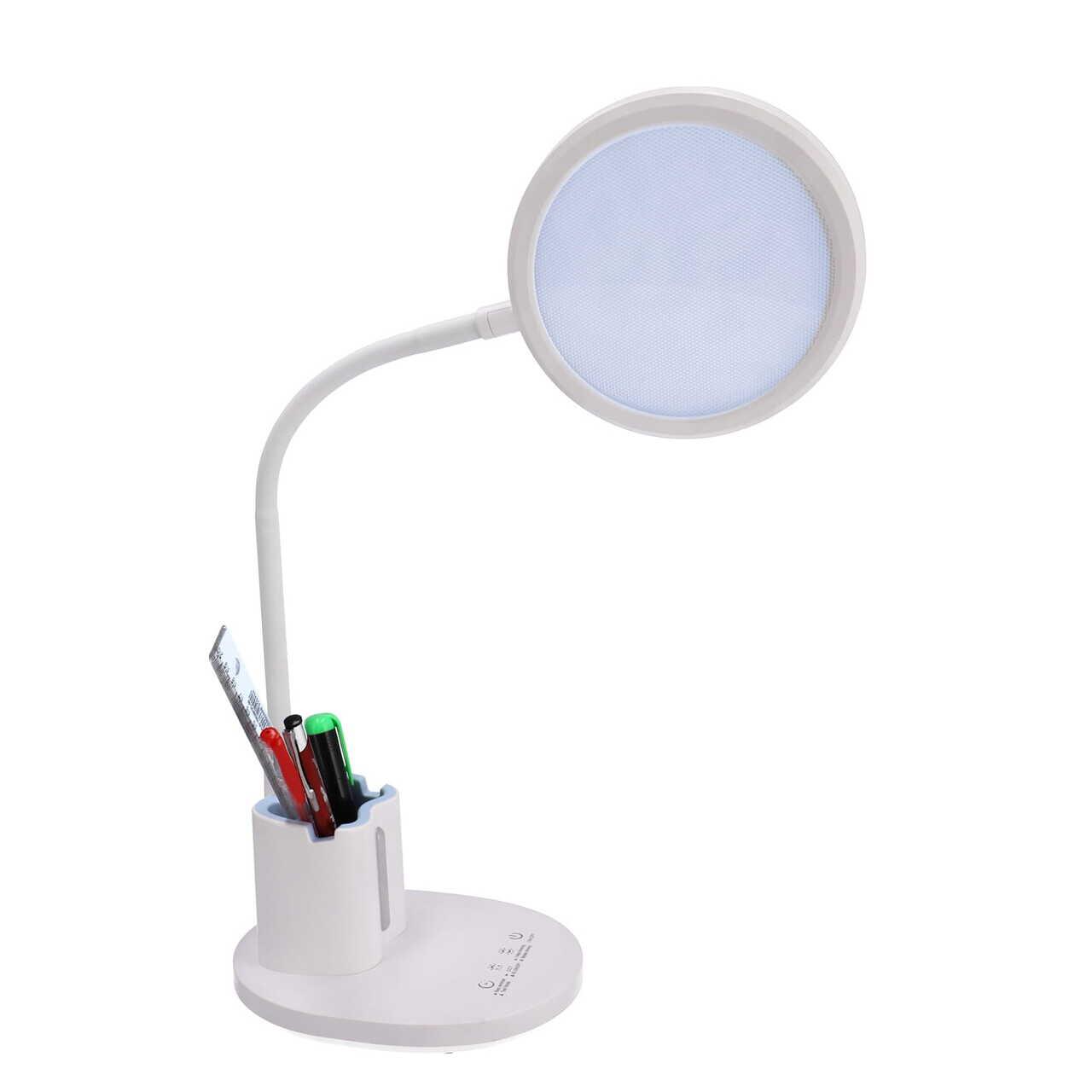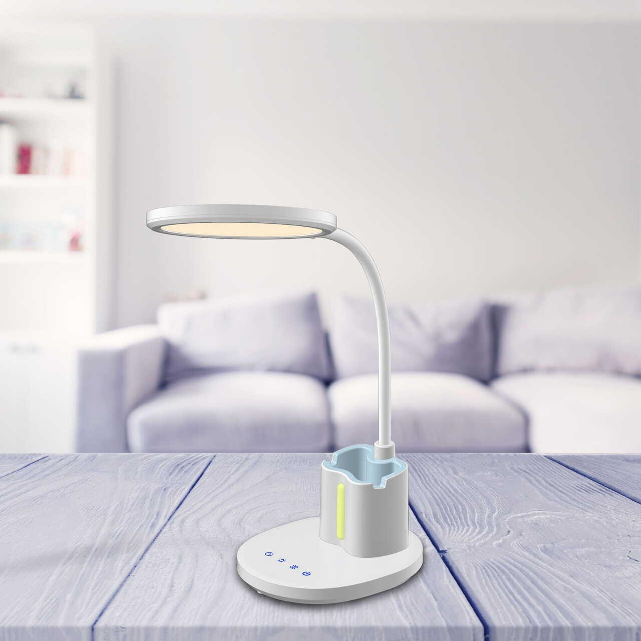 - A fehér, modern asztali lámpa tökéletes megvilágítást biztosít a munkahelyén. Ezenkívül további funkciókkal is rendelkezik, amelyek megkönnyítik az irodai eszközök rendszerezését. Ideális tanulószobákban vagy dolgozószobákban való elhelyezésre. Megbízható segédeszköz az olvasáshoz és az íráshoz.