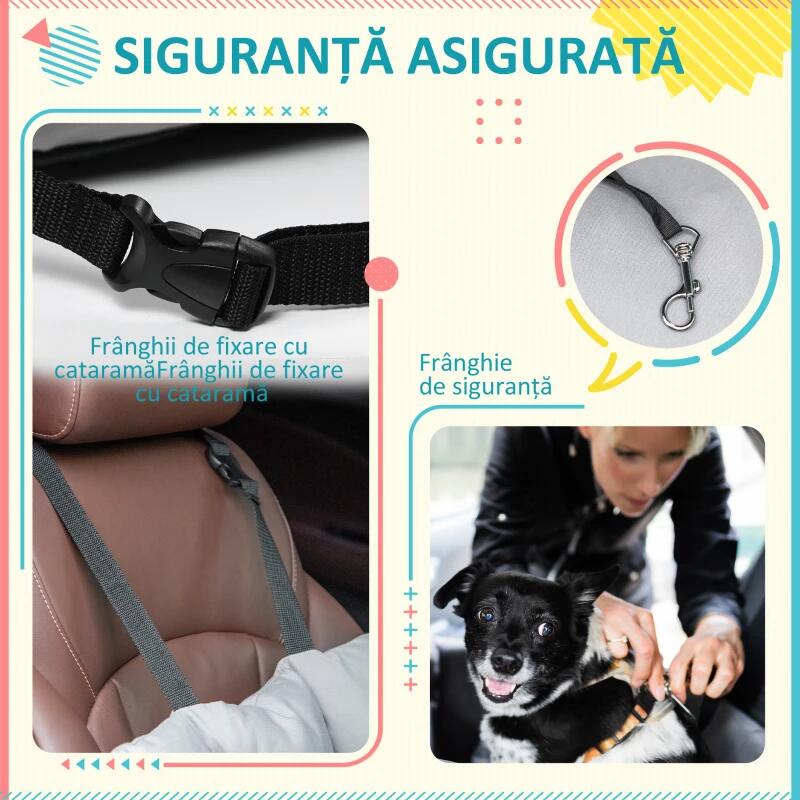 - Tartalmaz két biztonsági pántot az autósüléshez való rögzítéshez és egy biztonsági pórázt az állat számára