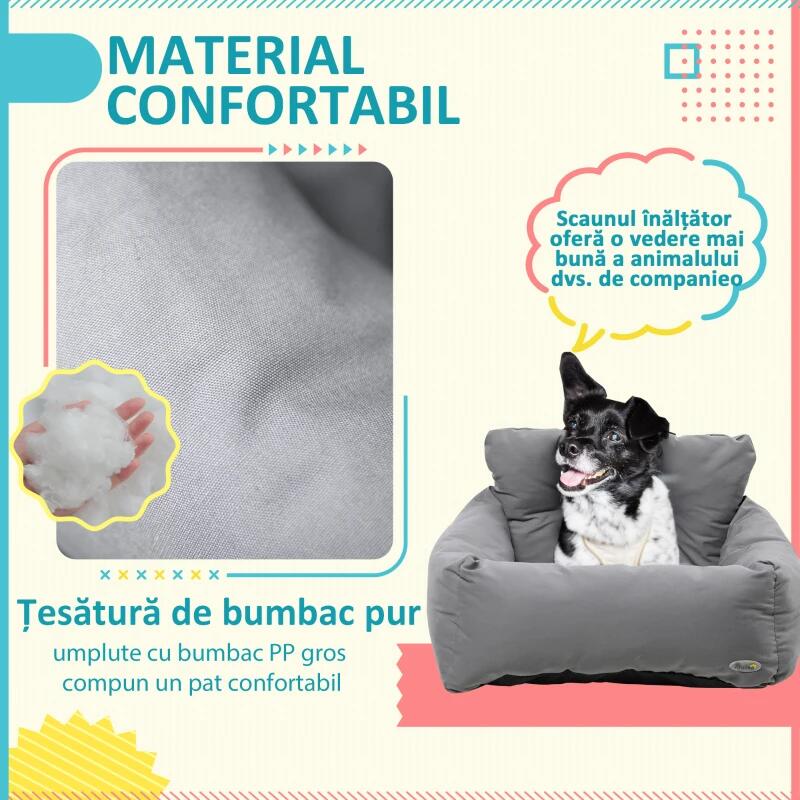 Autósülés kutyának/macskának, puha ágy típus, Oxford anyag, pamut, övvel, szürke, 50x54x33 cm