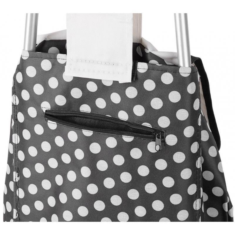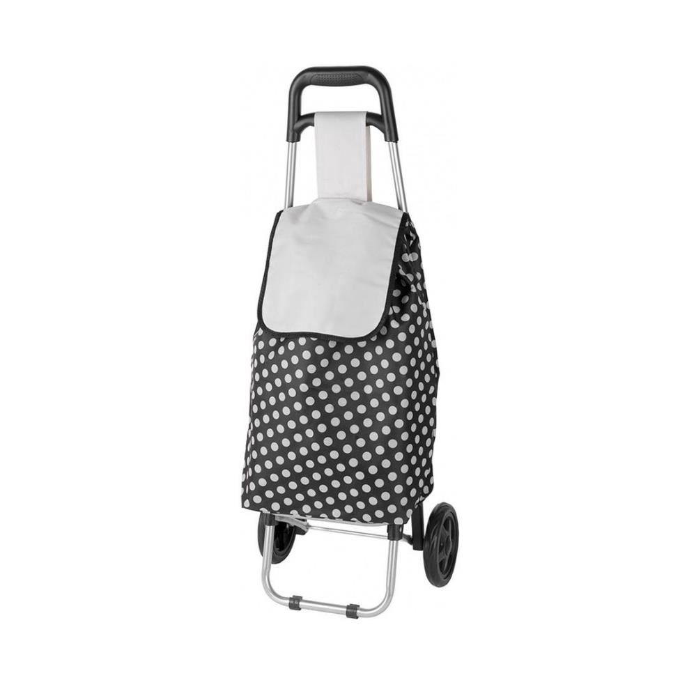 Vízálló anyagból készült bevásárlókocsi, fém kerettel, gumi fogantyúval, zsinórzárral és 2 zsebbel. Kézzel mosható anyagból készült.