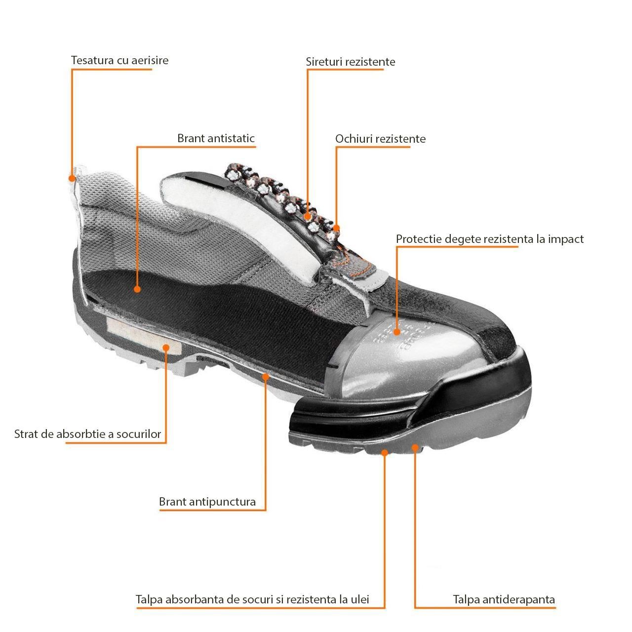 - Cipővédelmi osztály: S1P (ütésálló orr, csúszásmentes talp, zárt sarokvédő terület, energiaelnyelés a sarok területén, antisztatikus tulajdonságok, behatolásálló talp)