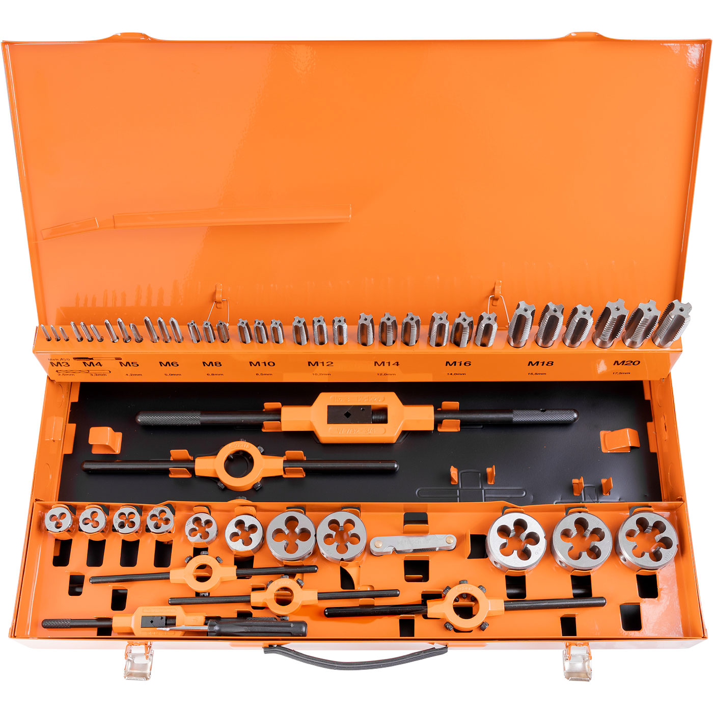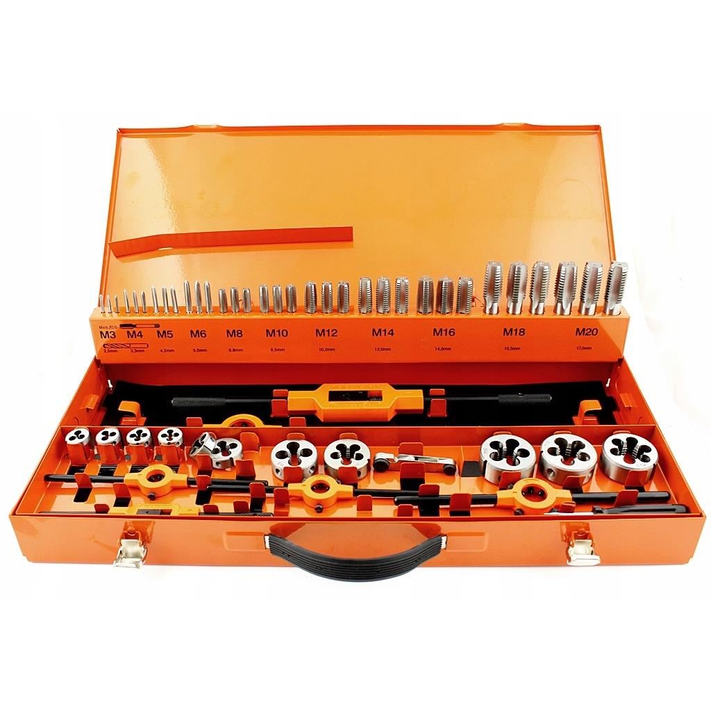 Menetfúró készlet, M3-M20 matricák, 54 darab, RICHMANN EXCLUSIVE A készlet tartalma: 33 x menetfúró: M3, M4, M5, M6, M8, M10, M12, M14, M16, M18, M20 11 x szerszám: M3, M4, M5 , M6, M8, M10, M12, M14, M1 ...