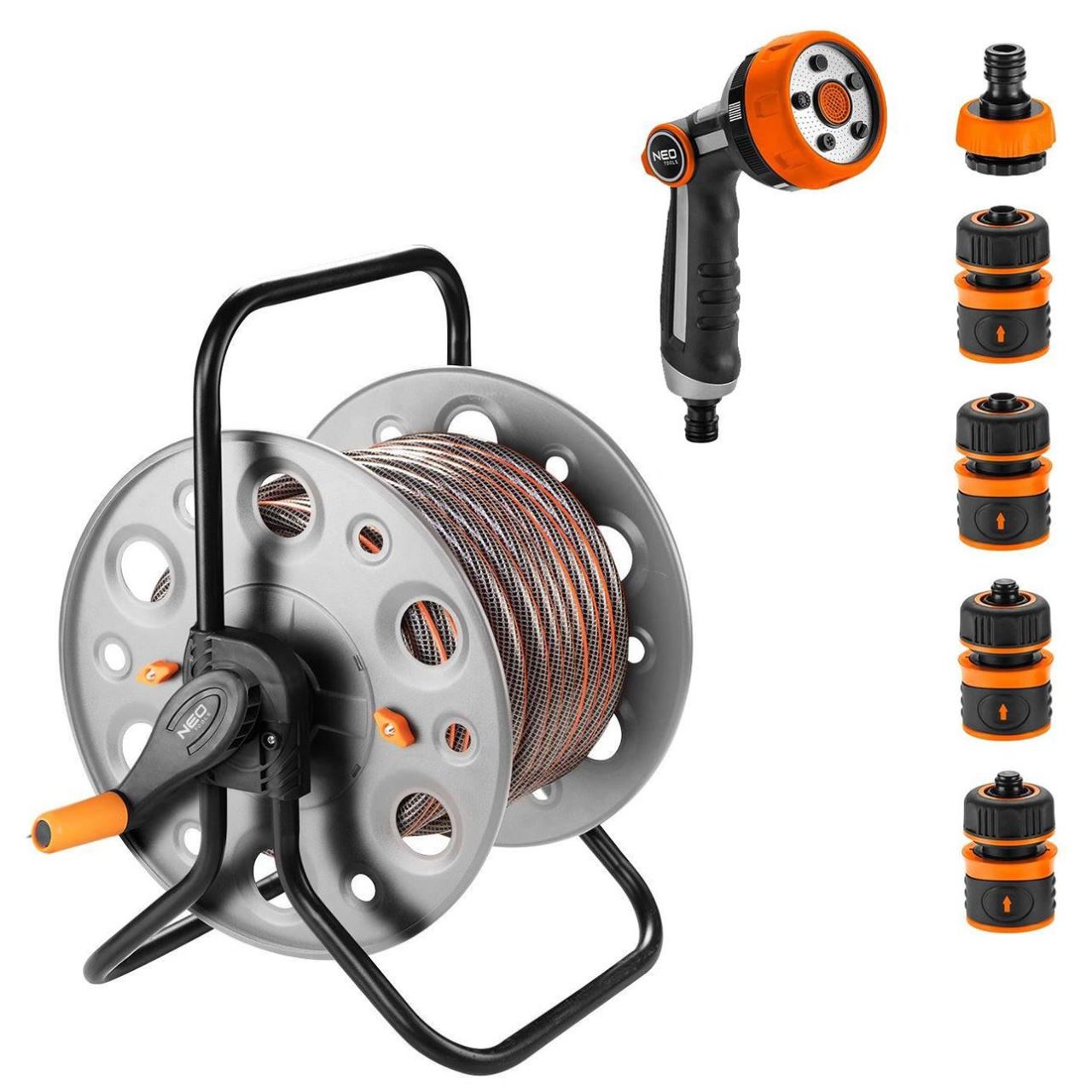 Az az  -től; NEO kerti szórópisztoly ideális minden háztartásba. 5 móddal rendelkezik: spray az Ön igényeinek megfelelően: jet erős, köd, légsugár, zuhany, diffúz sugár. A pisztoly hüvelykujjával működtethető ON/OFF  zárral rendelkezik, amely lehetővé teszi az   folyamatos működését. A markolat ergonomikus forma jól illeszkedik a kézbe, és nem csúszik, ami növeli a munka kényelmét. A szórópisztoly fém tárcsával rendelkezik.