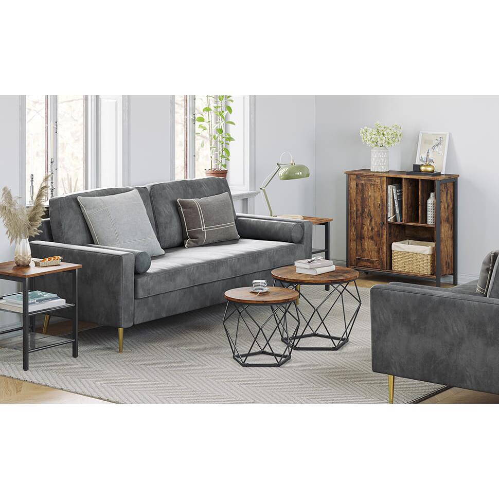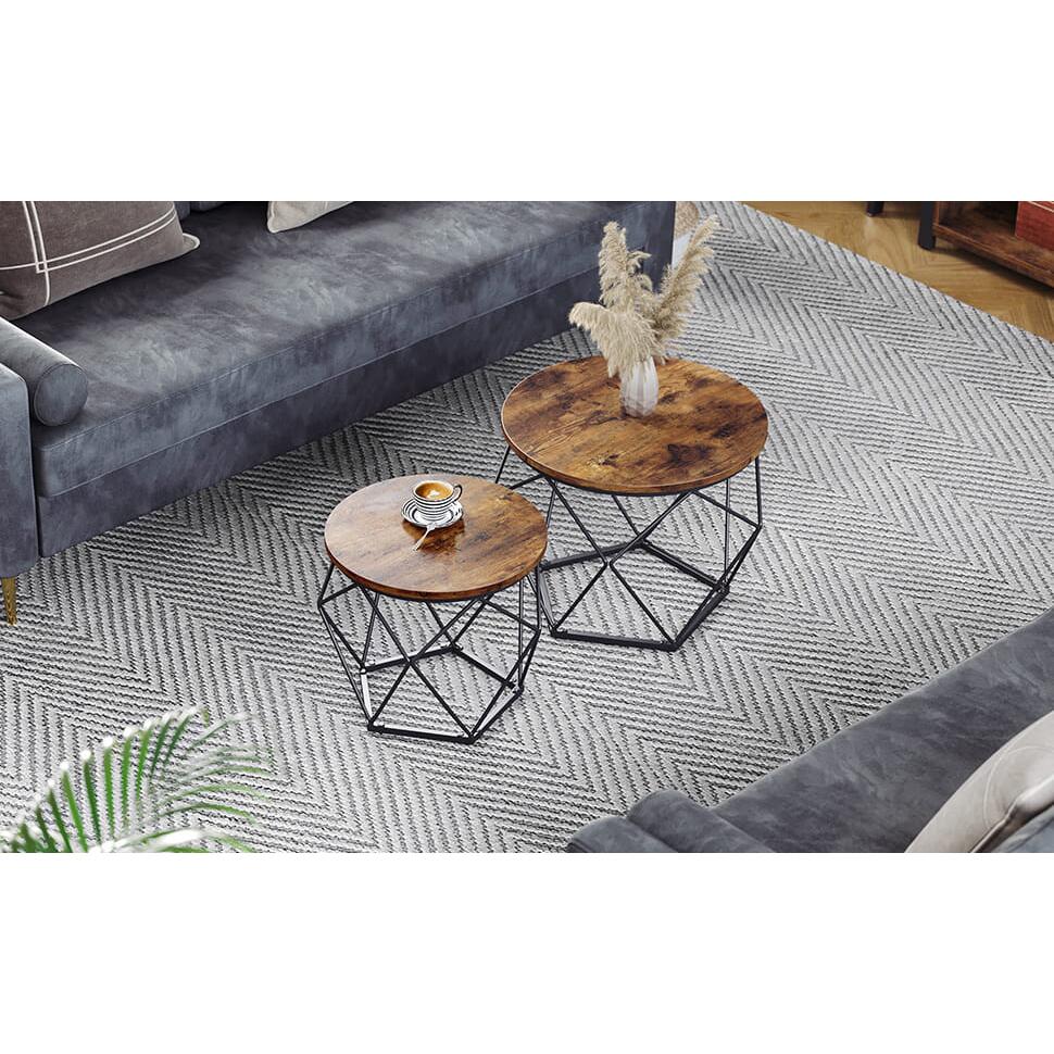 Dohányzóasztal, fém tárolókosárral, halvány tetejű, kerek, rusztikus barna és fekete, 2 méretű készlet