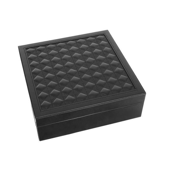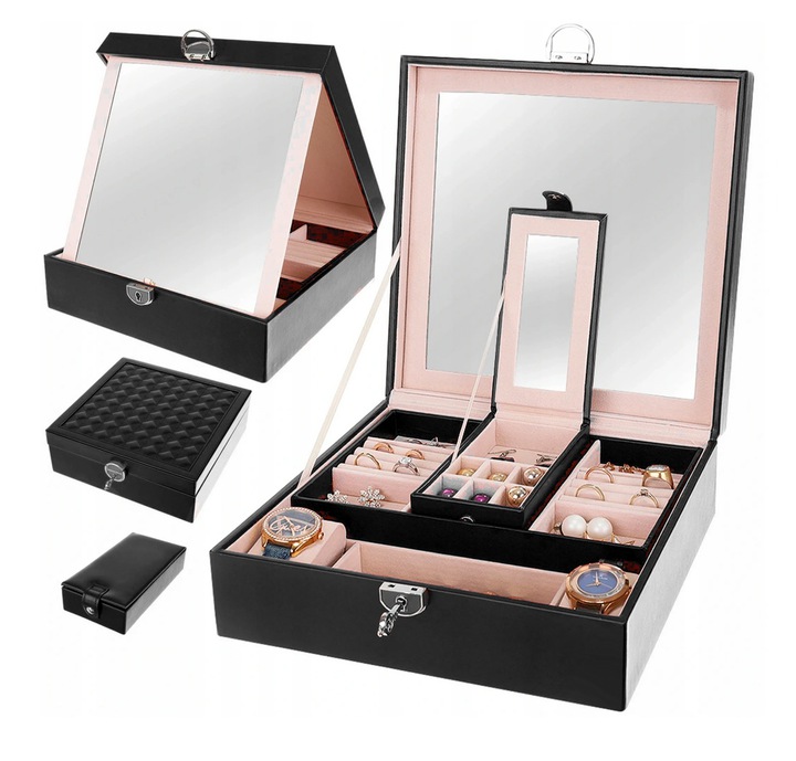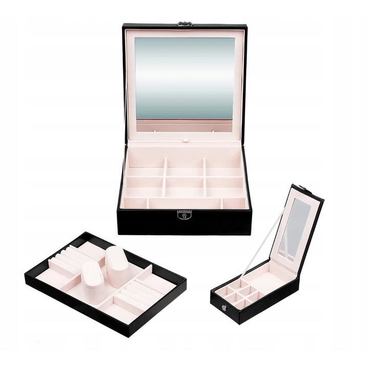 - NAGY KAPACITÁS - a doboz egy levehető fedőből áll, 2 rekesszel a gyűrűk számára görgőkkel, 4 rekesszel egyéb ékszerek számára, egy levehető dobozból. Alul 6 további rekesz található, 2 betét az óráknak vagy karkötőknek és 1 nagy, téglalap alakú rekesz a nagyobb tárgyaknak. A rekeszek puha anyaggal vannak bélelve, hogy megóvják a finom ékszereket a karcolásoktól.