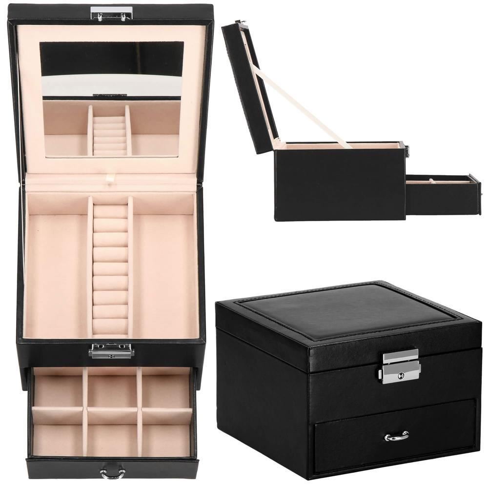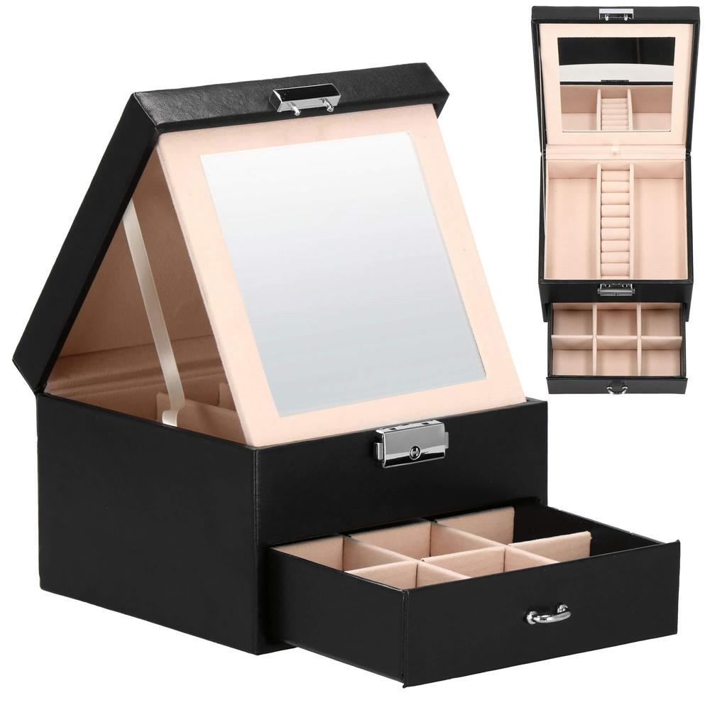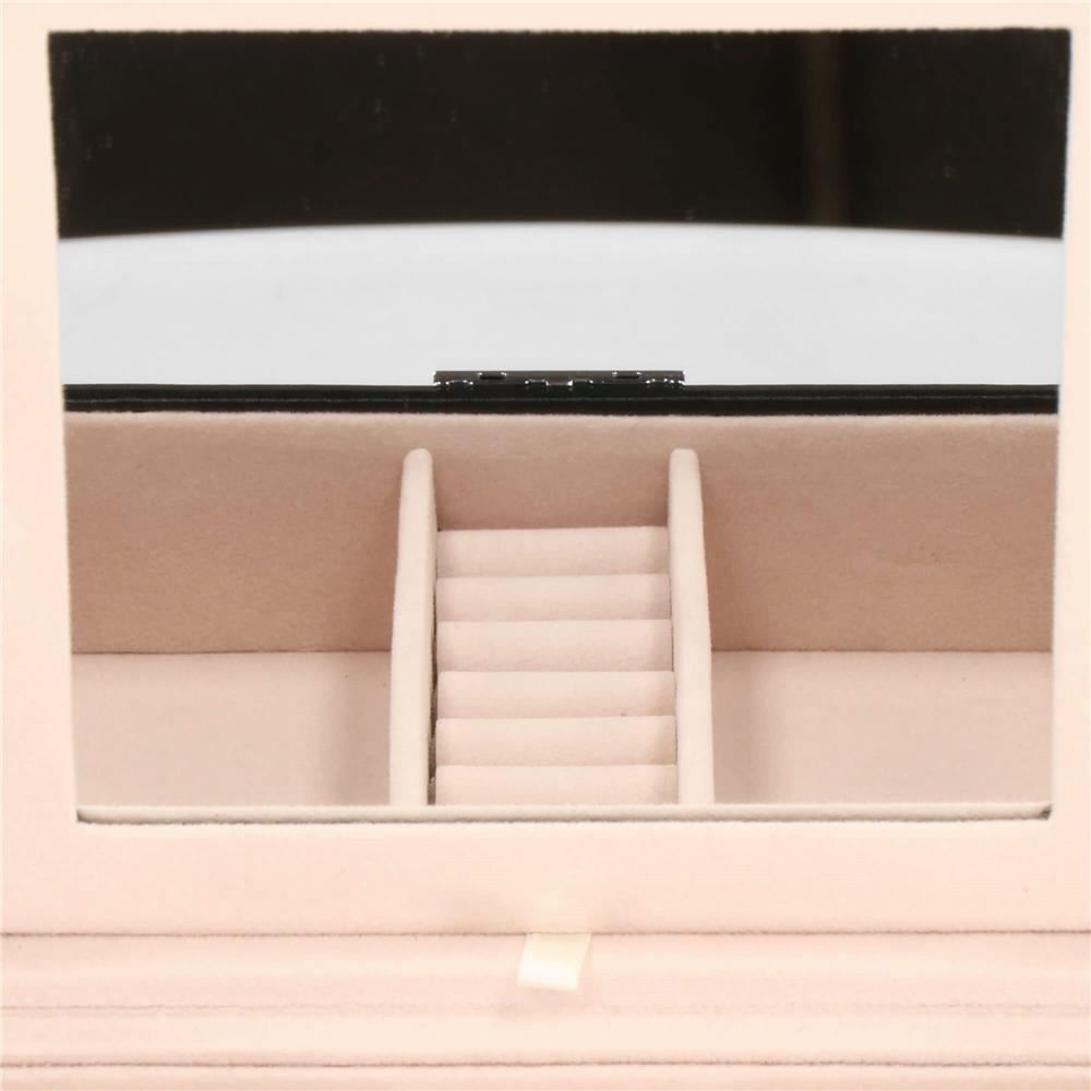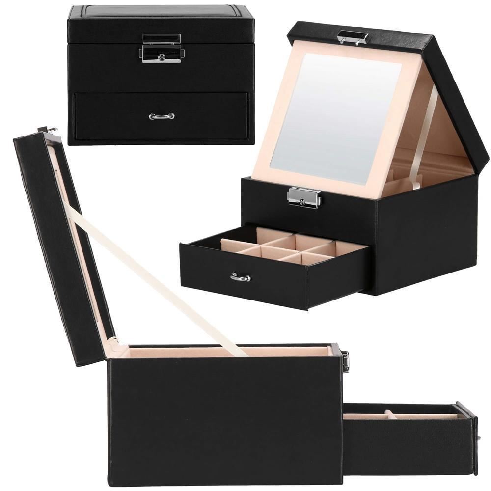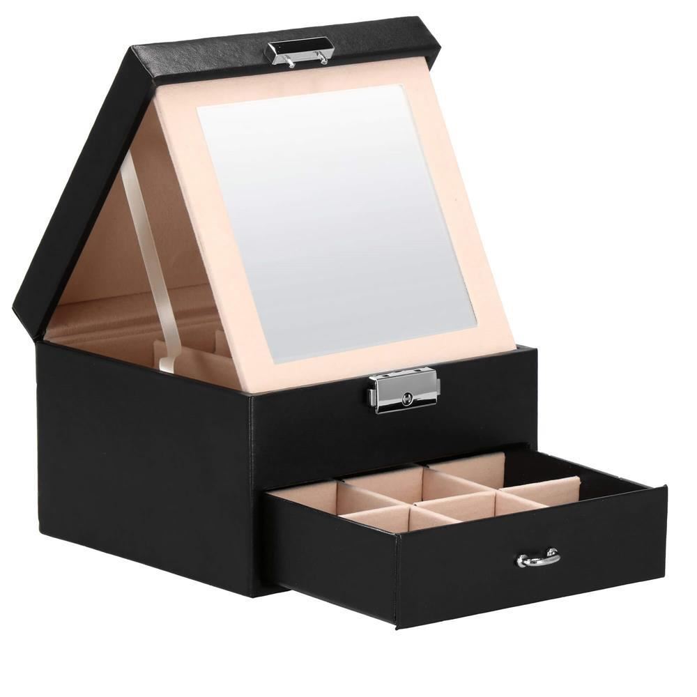 Ékszerdoboz, velúr és ökológiai bőr, fekete és rózsaszín, tükörrel, 16x16x11 cm, Springos