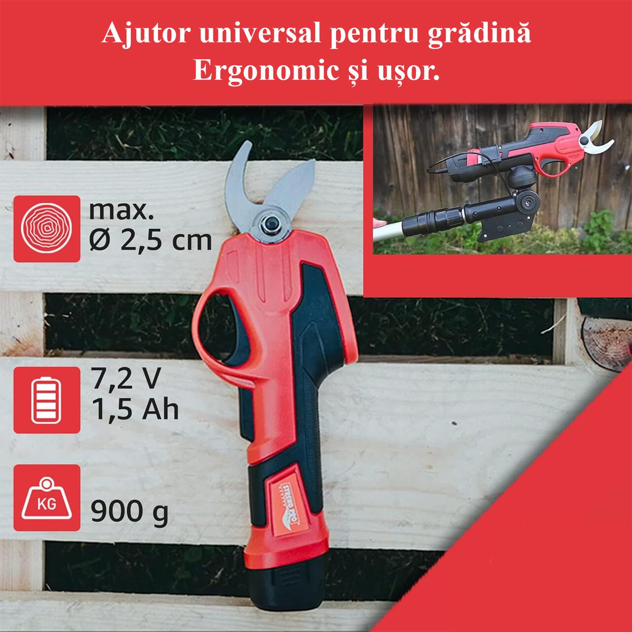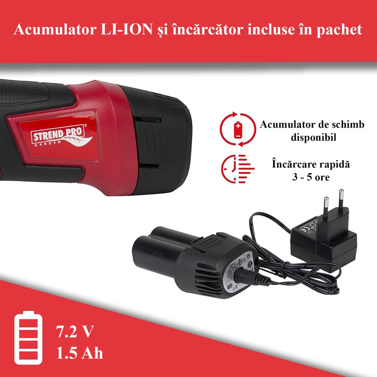 Elektromos kerti olló, 1,5 Ah akkumulátorral, 7,2 V-os töltővel, teleszkópos nyéllel, Strend Pro