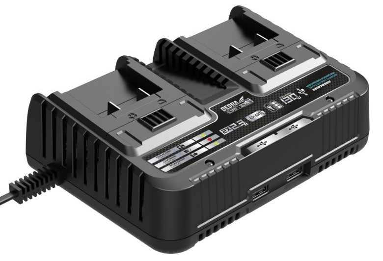 - 1 x kettős akkumulátortöltő, 18V, Li-ion, 2x2,3A, SAS + ALL, Dedra