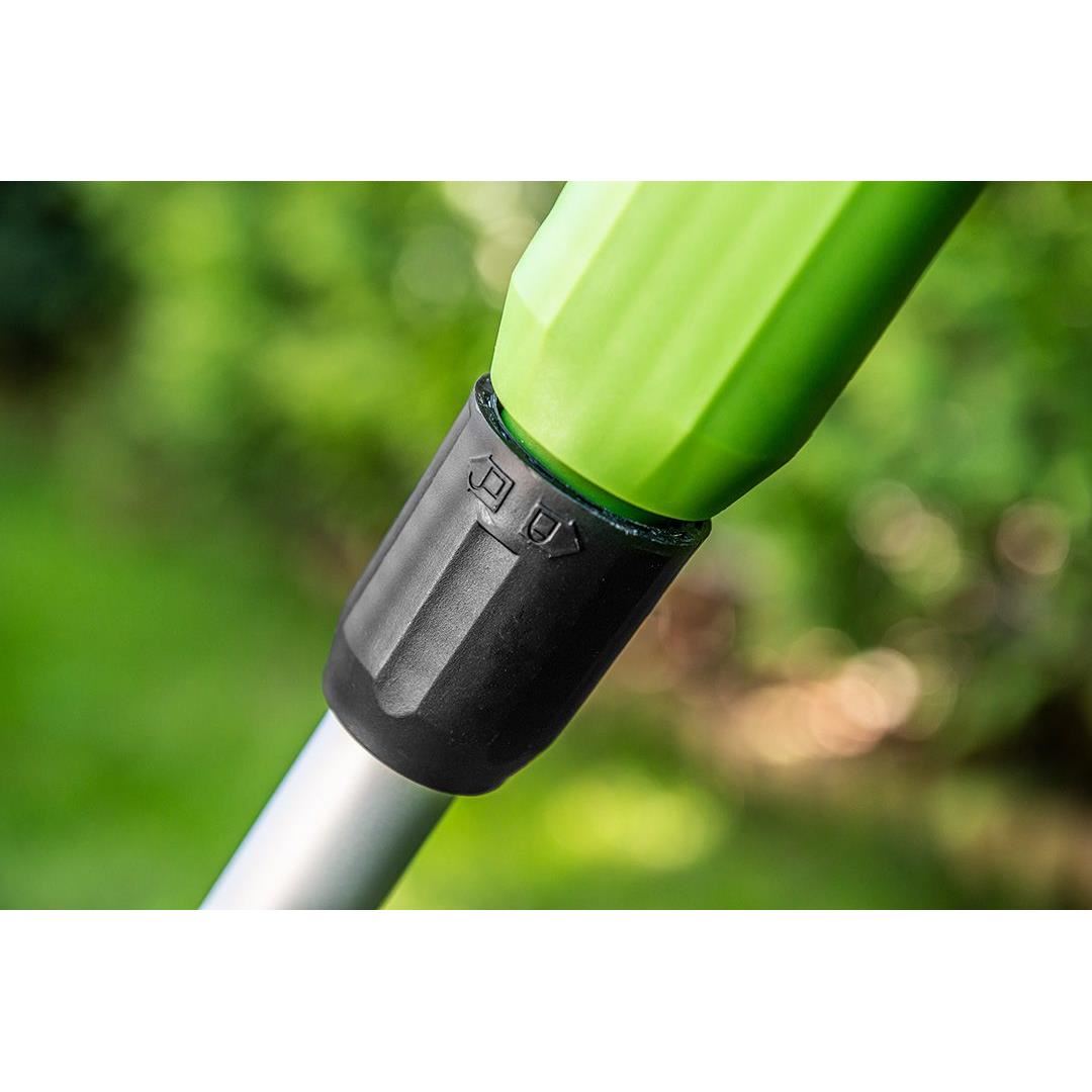 Az extra kényelmes, állítható fogantyú és a teleszkópos cső kényelmes munkát biztosít a kertben.