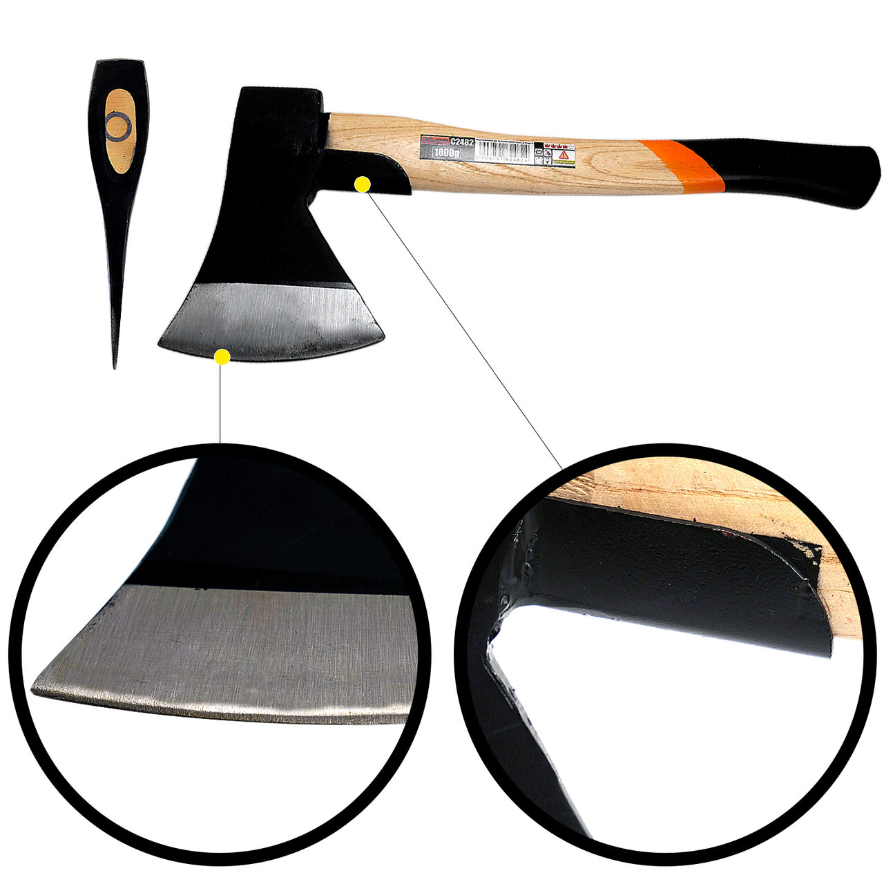 - A fejsze farka  -ből; fából és  -ből; METAL PROTECTION -vel van ellátva; (védi a sérüléseket a vágás közbeni rossz ütések esetén)