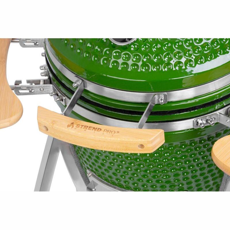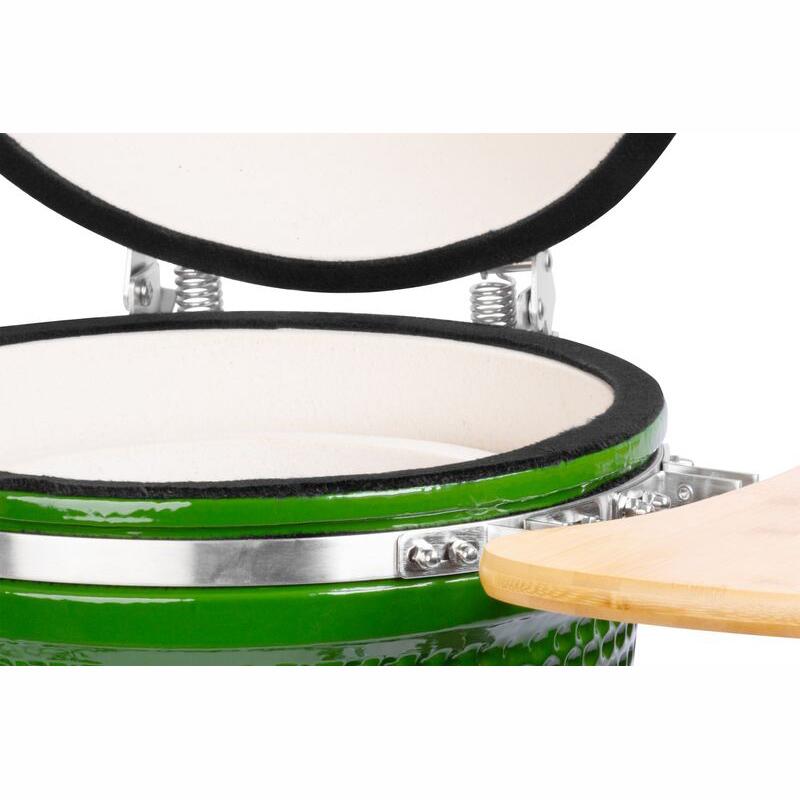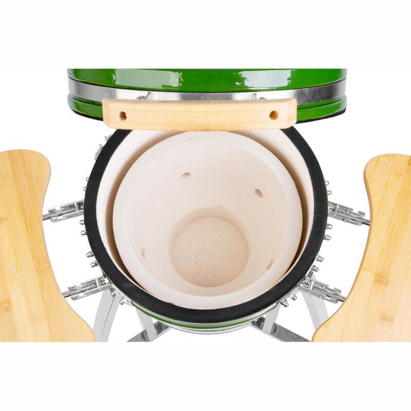 Faszén kerti grill, körgrill, kerámia, kerekekkel, fedéllel, polcokkal, zöld, 40x97,5 cm, Kamado Egg 16