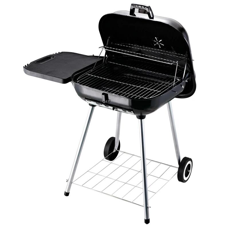Faszén kerti grill, téglalap alakú grill, kerekekkel, fedéllel, polcokkal, 53 cm, 89x60x83 cm