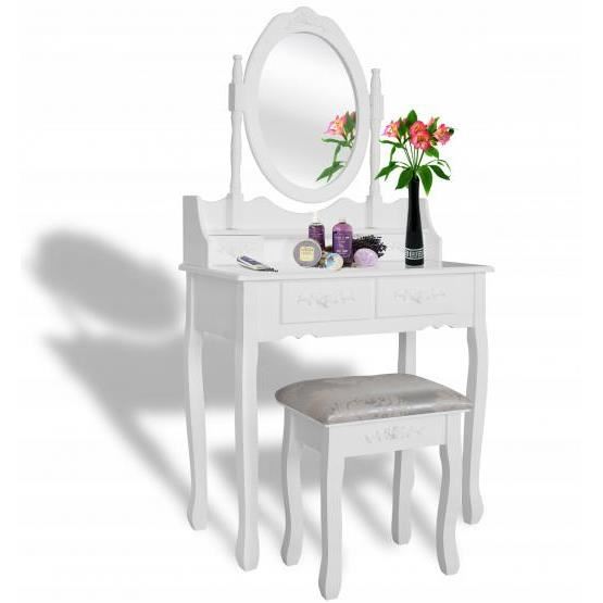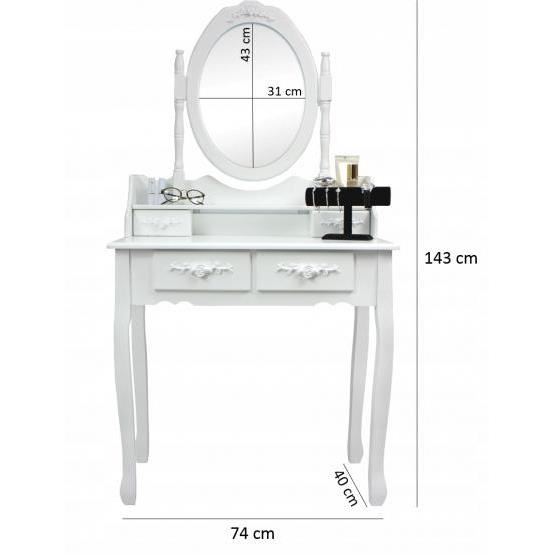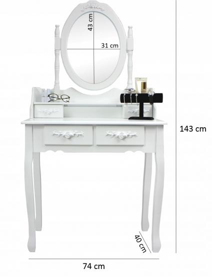 Fehér sminkasztal, vintage stillus, tükörrel és kárpitozott székkel, 74x40x143 cm