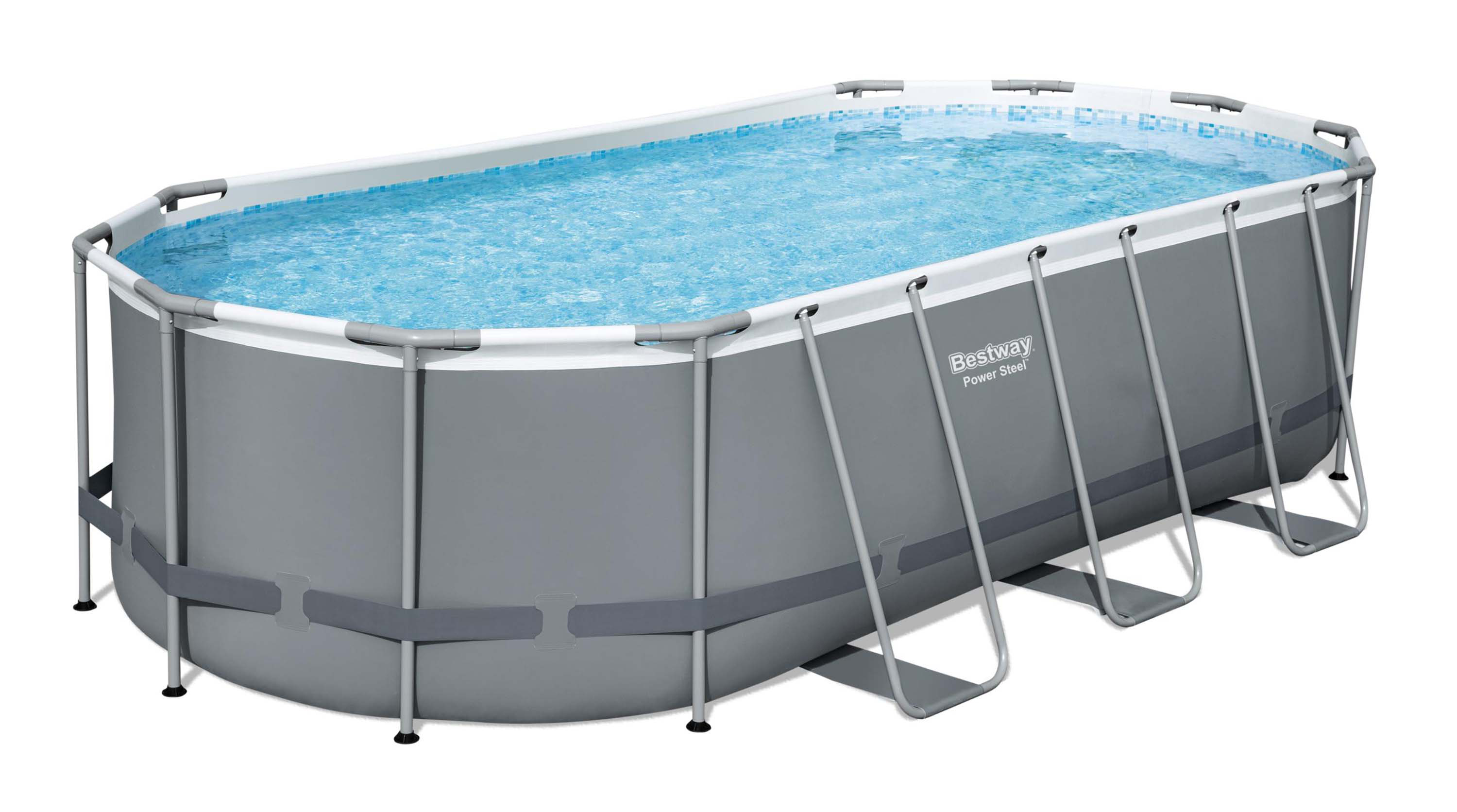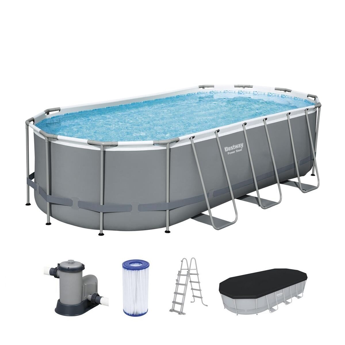 Fém szerkezetű medence, ovális, szűrővel, pumpával, létrával, adagolóval, ponyvaburkolattal, szürke, 549x274x122 cm, Bestway Power Steel