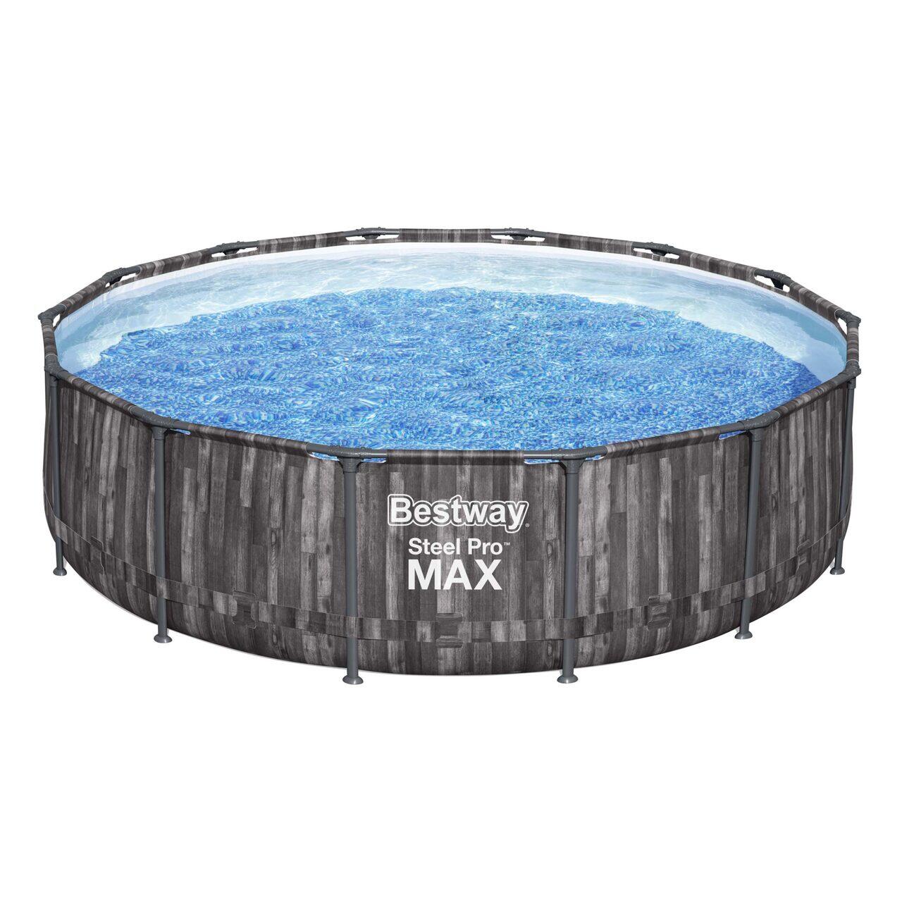 Fémszerkezetes medence, kerek, szűrővel, pumpával, létrával, ponyvaburkolattal, fa modellel, szürke, 427x107 cm, Bestway Steel Pro