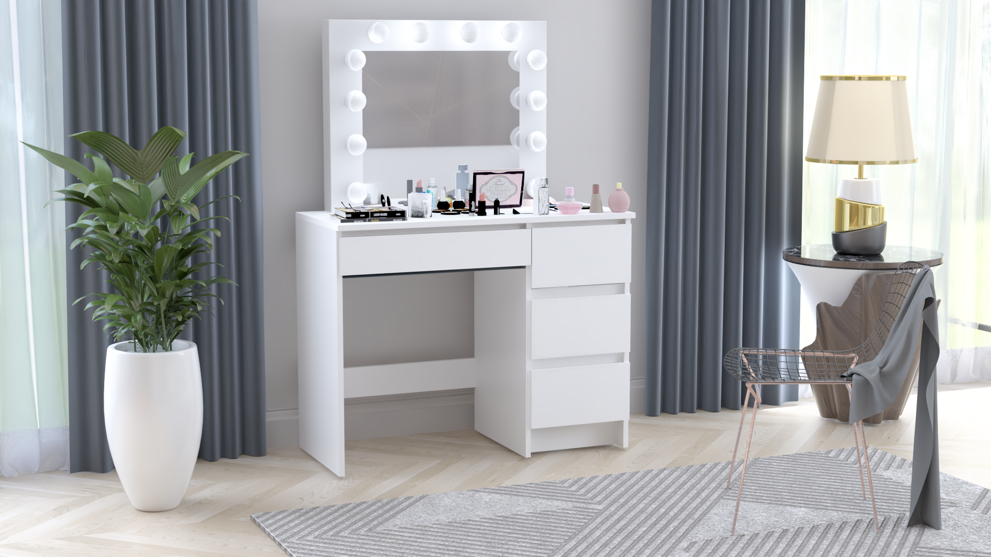 - A jobb oldalon 3 kisebb fiókkal, a tükör alatt pedig egy nagyobb fiókkal van felszerelve. Bőséges helyet kínálnak, amelyben tárolhatja a smink- vagy higiéniai kiegészítőket, amelyeknek mindig kéznél kell lenniük.