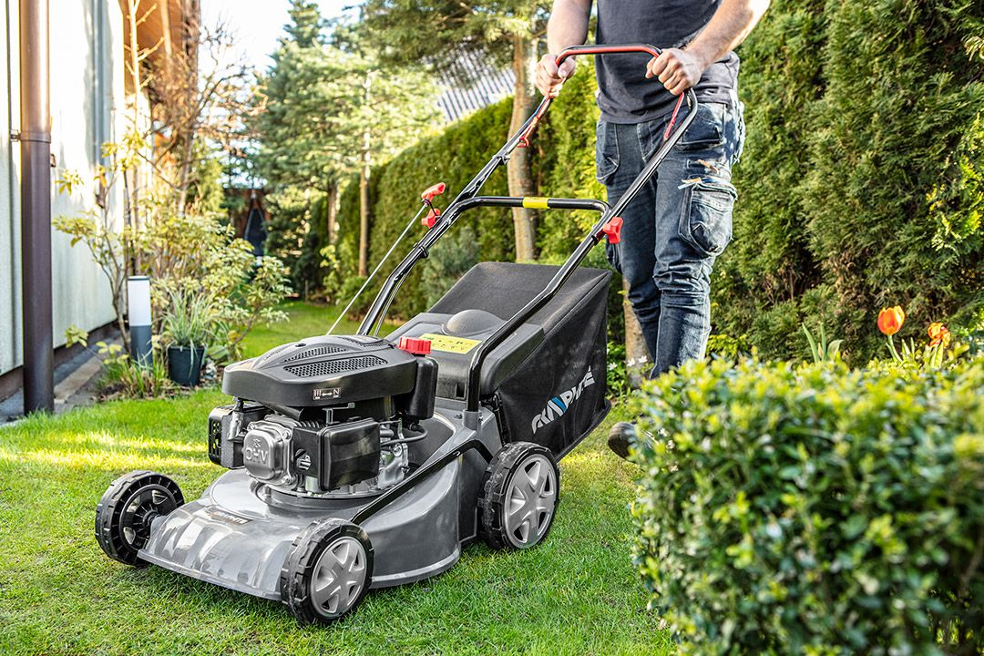 A Graphite benzines fűnyíró, 1,8 LE teljesítményével ideális fűnyíráshoz.