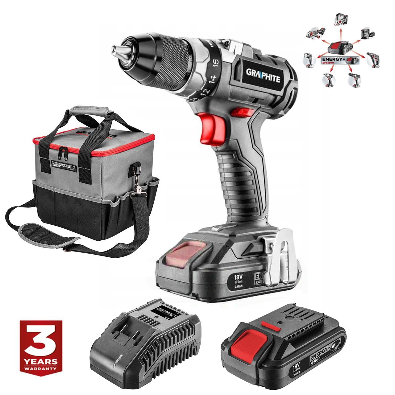Fúrógép, csavarhúzó (fúró),  -vel; 2db akkumulátor 2 Ah, töltő, 18 V Li-ion, táska, kefe nélküli, tokmány 2-13 mm, Graphite Energy