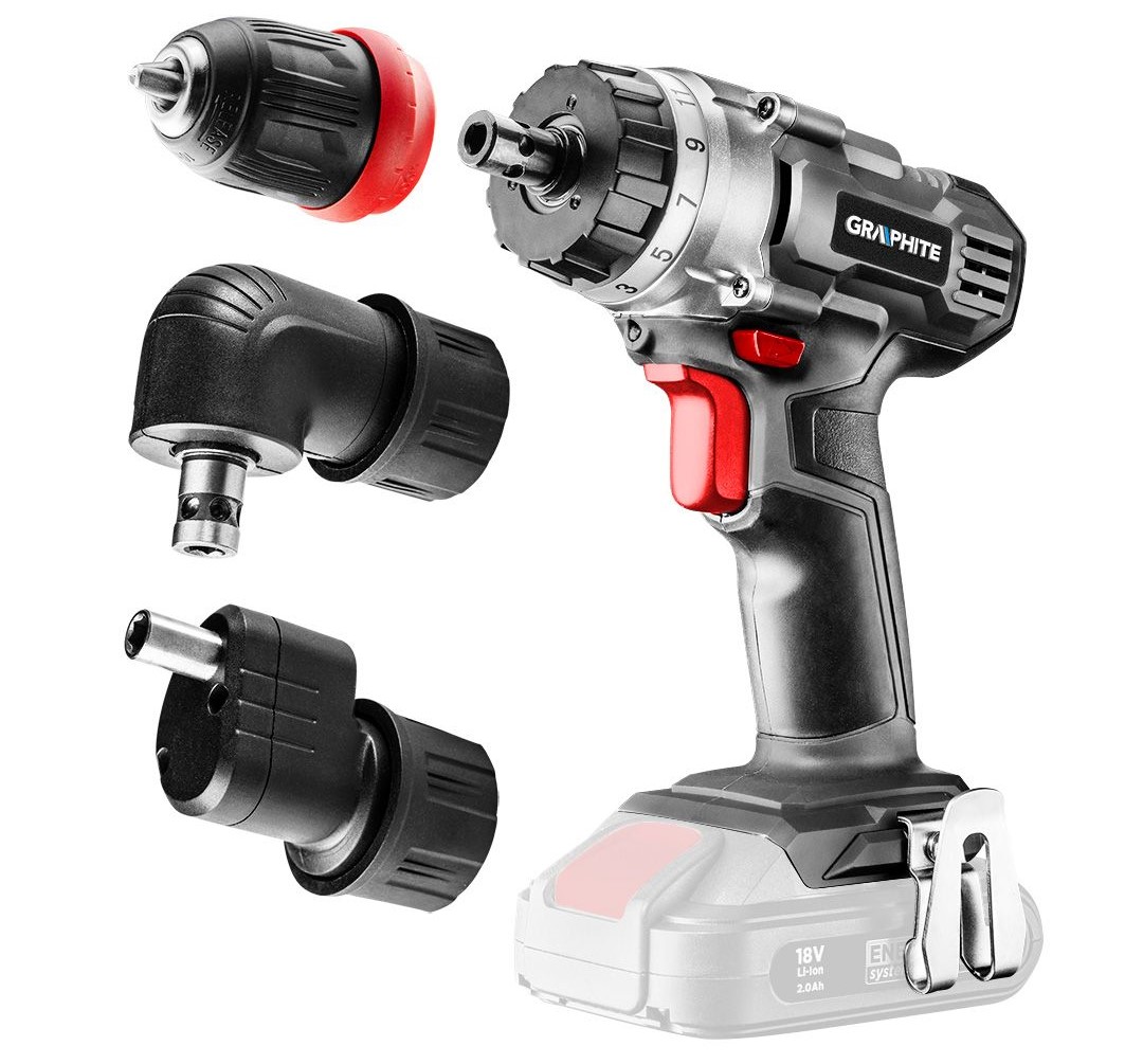 Fúrógép, csavaros (fúró), akkumulátoron, 18 V Li-ion (az akkumulátor nem tartozék), 3 levehető tokmány, 10 mm-es tokmány, Graphite Energy