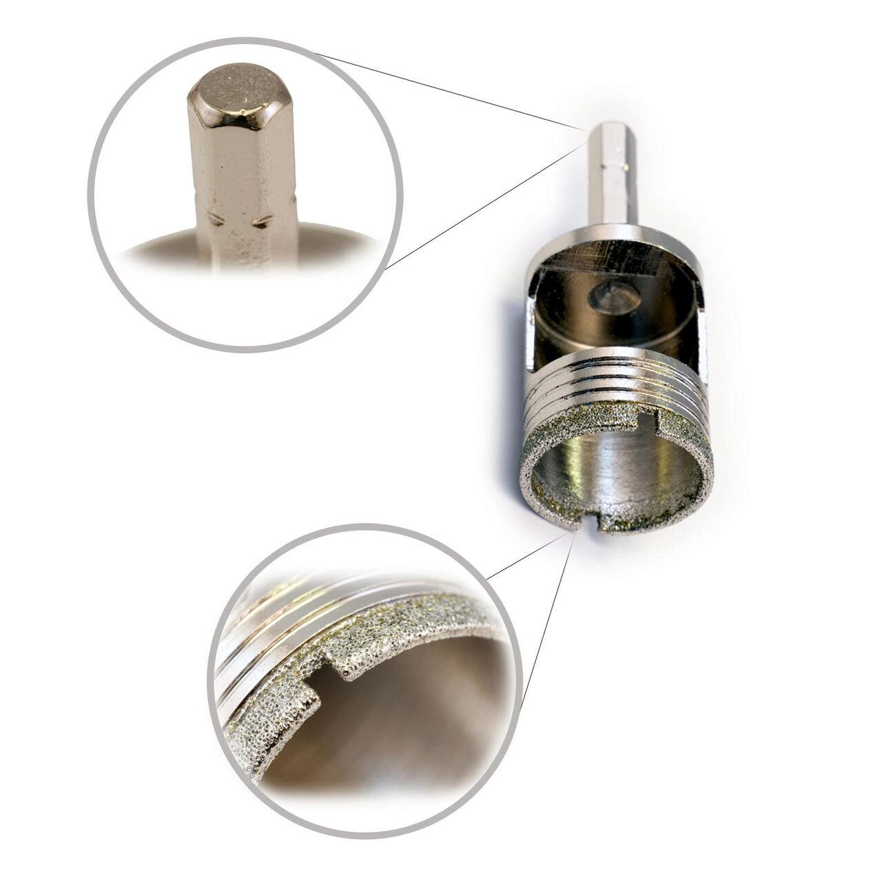 * Hatszögletű tartókonzollal rendelkezik, és  -nél használható; csempe, porcelán csempék, üveg, kő, gránit, üvegszál fúrása, hasznos csapok, zuhanyzók, csövek beépítésében konyhafelújításoknál és fürdőszobákban.