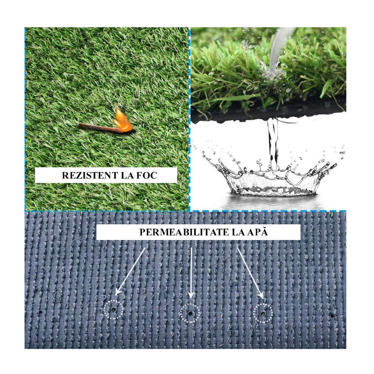 Az ökológiai műfű kisállatbarát, gyermekek számára biztonságos, UV védelemmel rendelkezik, tűz- és időjárásálló, valamint vízelvezető nyílásokkal rendelkezik.