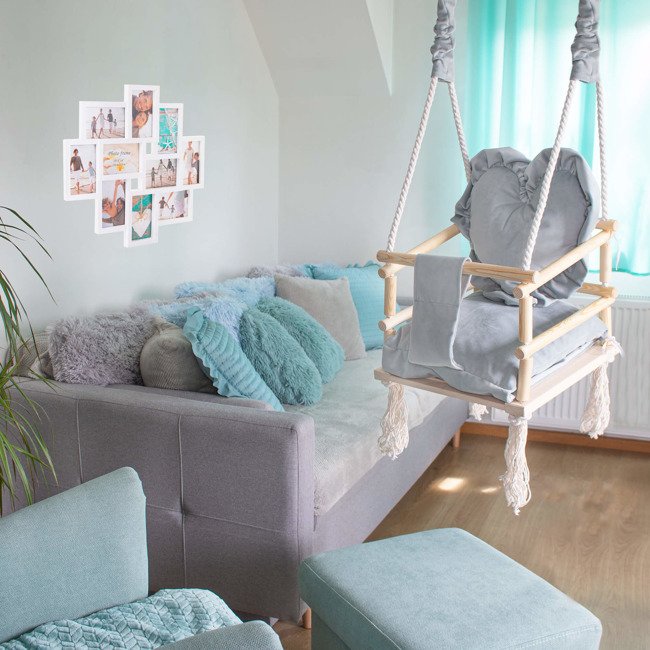 Fából készült gyerekhinta szívpárnákkal 33,4x34,5x25 cm, világoskék, SPRINGOS Szín: világoskék / fa Anyag: puhafa, szövet Hinta szélessége: 33,5 cm Mélység ...