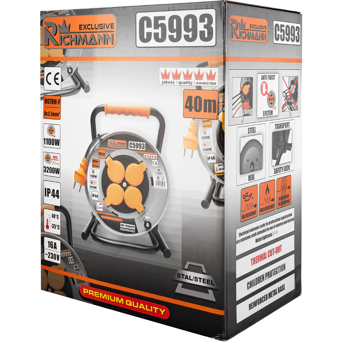 Ipari elektromos hosszabbító kábel, dob, 3x2,5 mm² ;, IP44, 40 m, Richmann Exclusive