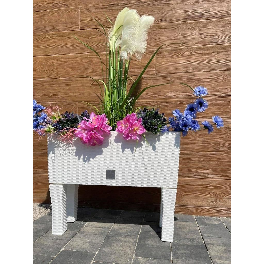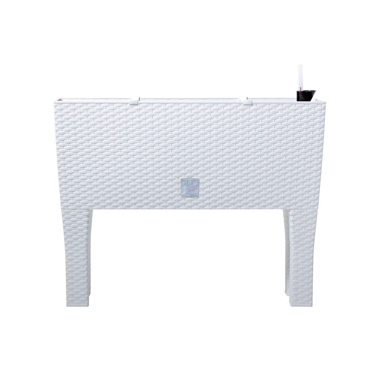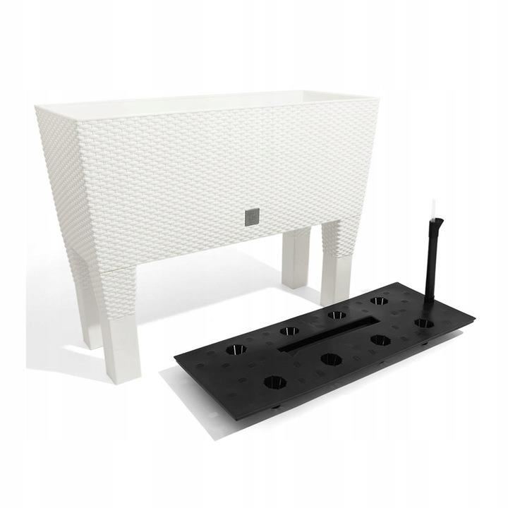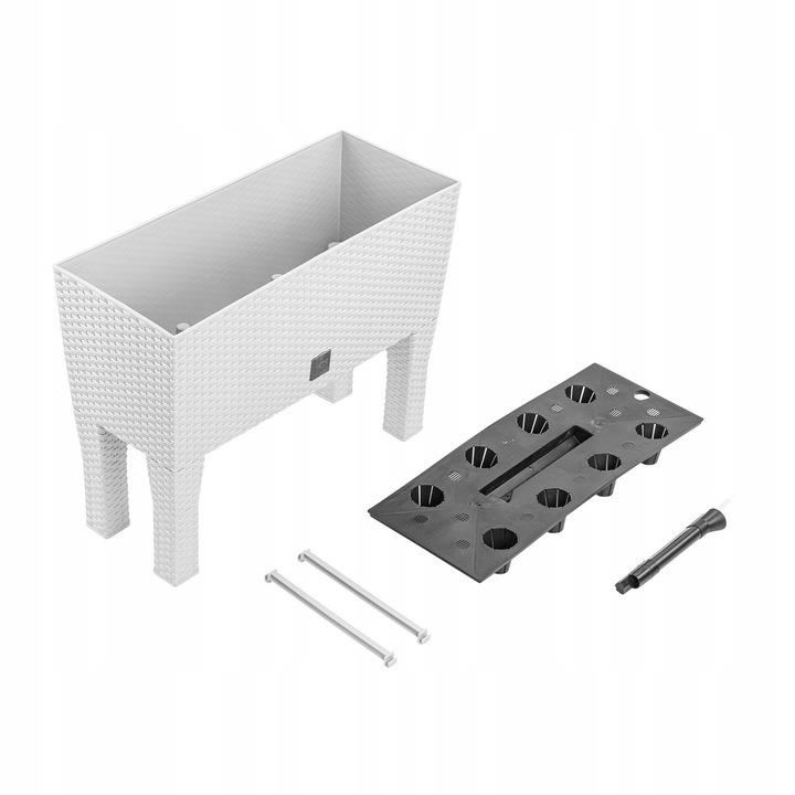 Dekoratív virágtartó, lábakkal, öntözőrendszerrel, rattan utánzat, fehér, 30 L, 60x25x46 cm, Rato Case High