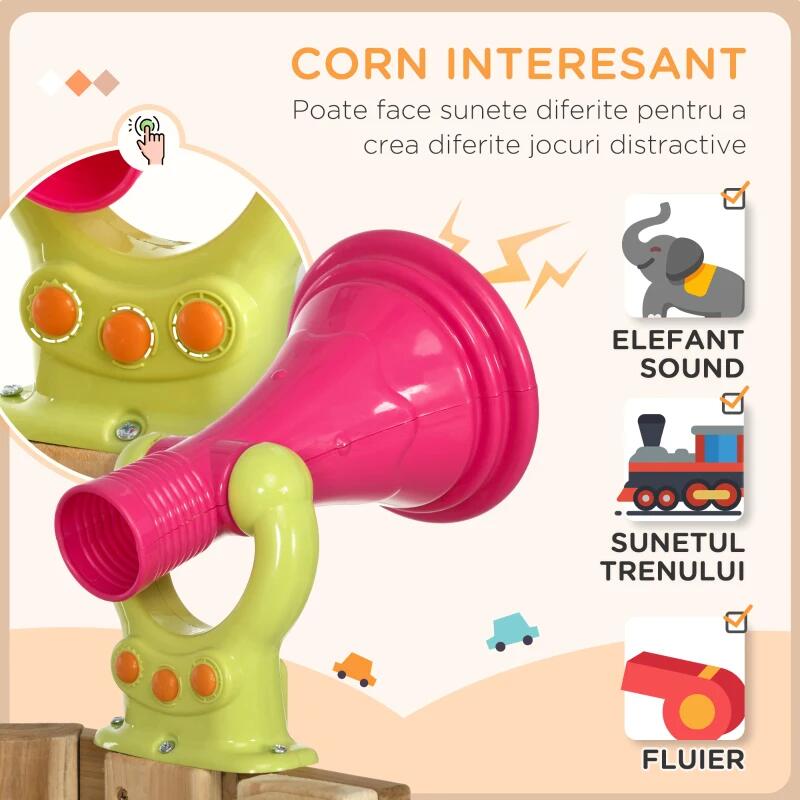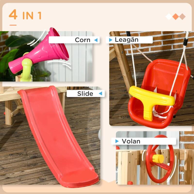 Játszókomplexum gyerekeknek 18 hónapos-4 éves korig, 4 az 1-ben, hintával, csúszdával, kormánnyal, kürttel, natúr és piros, 200x170x118 cm