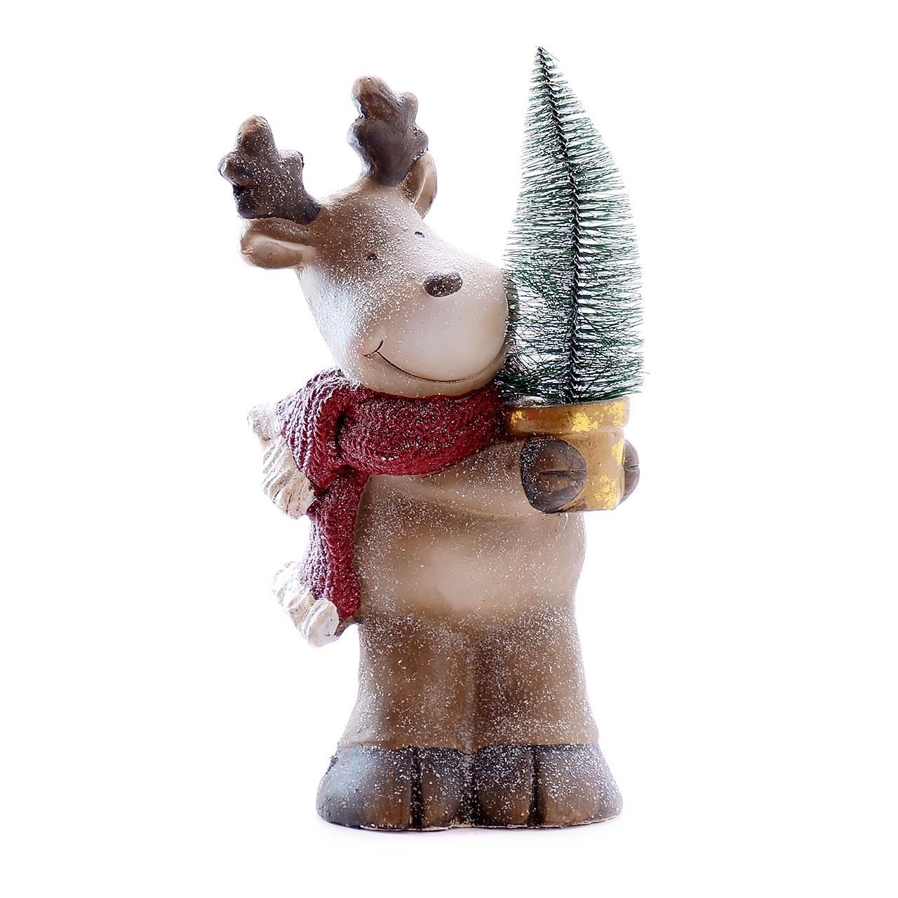 Karácsonyi dekoráció, kerámia, rénszarvas fával cserépben, LED, 2xLR44, 21x14x39 cm, Chomik