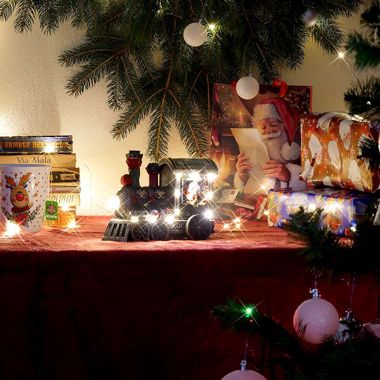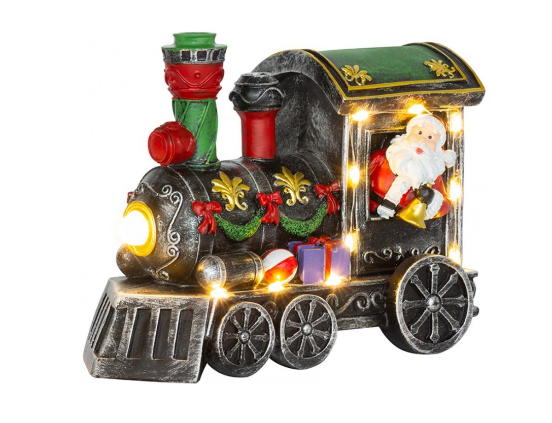 Karácsonyi dekoráció, polirezin, Mikulás díszített mozdonyban, LED, 3xAA, 18x9,2x14 cm, Magic Home