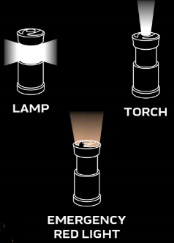 Három világítási funkciója van: zseblámpa, lámpa és piros figyelmeztető lámpa.