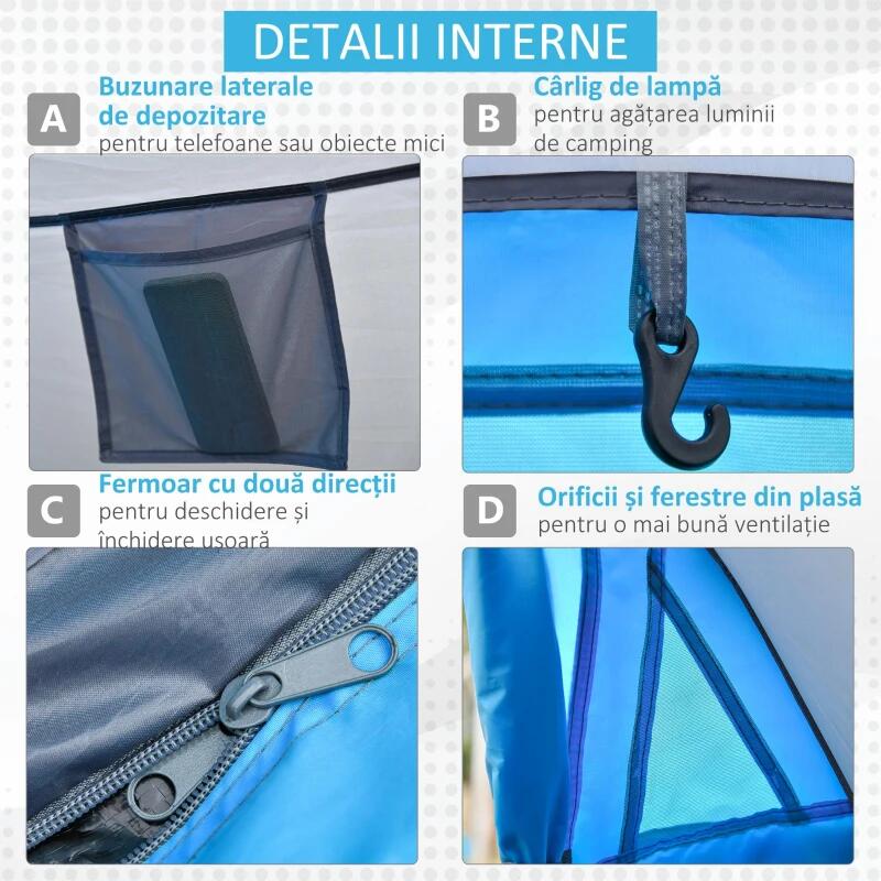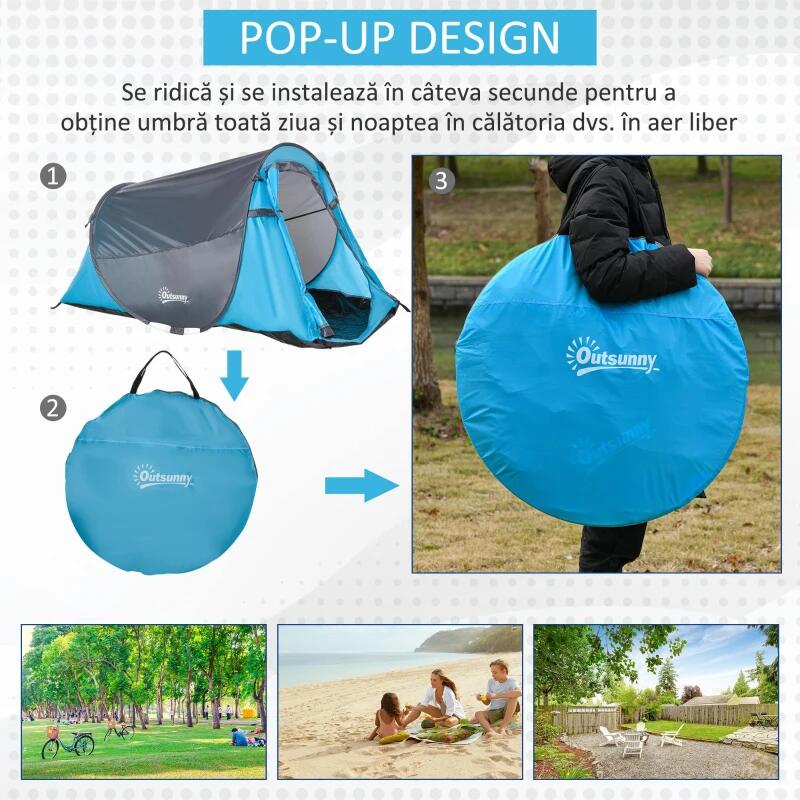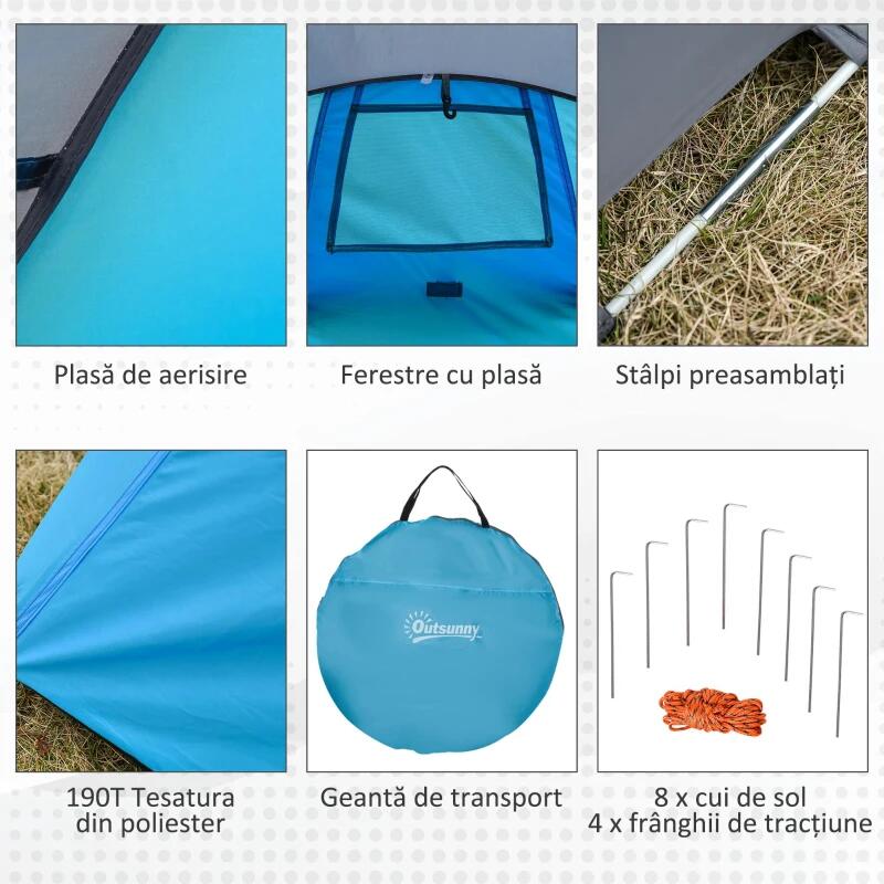 Kempingsátor, 2 személyes, vízálló, jégkunyhó típusú, huzattal, világoskék, 286x209x122 cm
