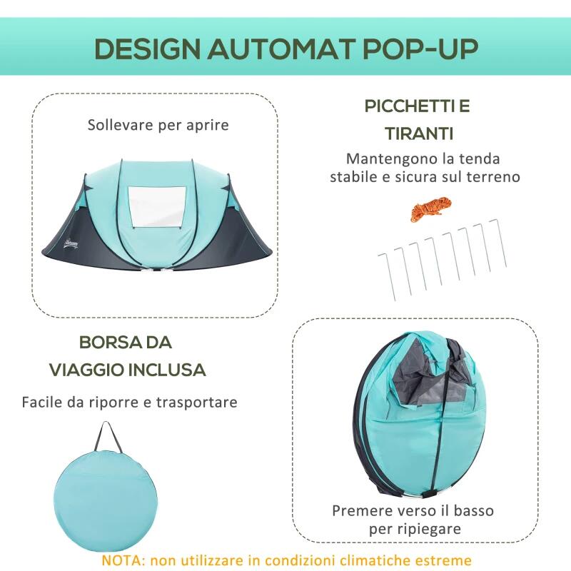 Kempingsátor, 4 személyes, vízálló, jégkunyhó típusú, 2 ablakos, 2 bejáratú, fedős, automata nyitású, világoskék és szürke, 286x209x122 cm