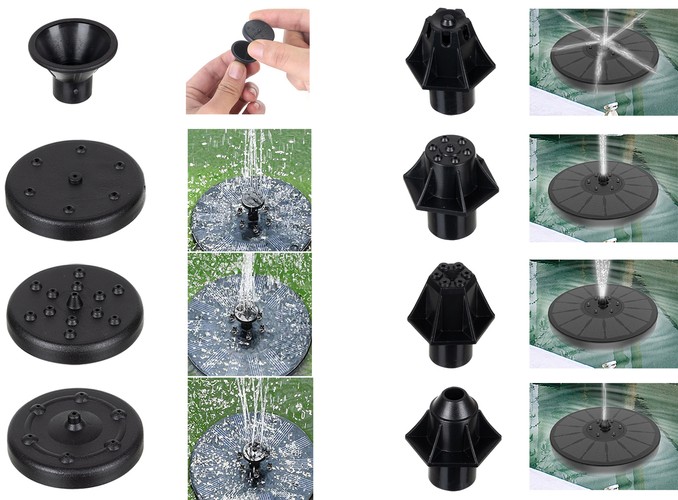 - 7 CSERÉLHETŐ FEJ - a szökőkút 7 cserélhető fúvókával rendelkezik a szivattyú számára, amely lehetővé teszi a leeresztett víz alakjának megválasztását felfelé. Így a szökőkút alakját ízlése szerint módosíthatja.