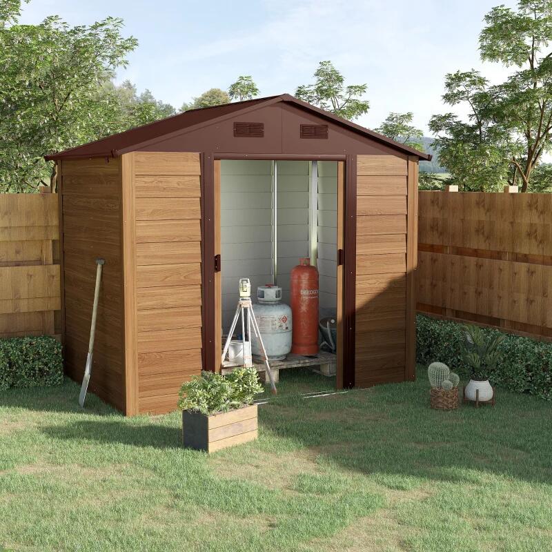 Kerti fészer/tároló fészer szerszámok tárolására, acél és PP, barna fa hatású, 236x152x209 cm
