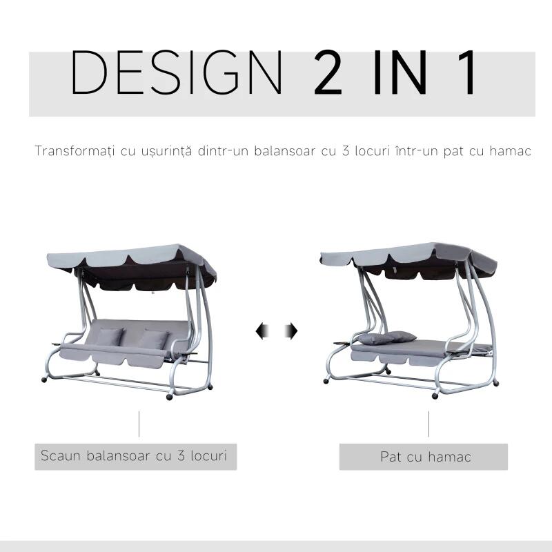Kerti hinta, 3 férőhelyes, szürke, 200x120x164 cm, ágyfunkciós, max 340 kg, Tripoli