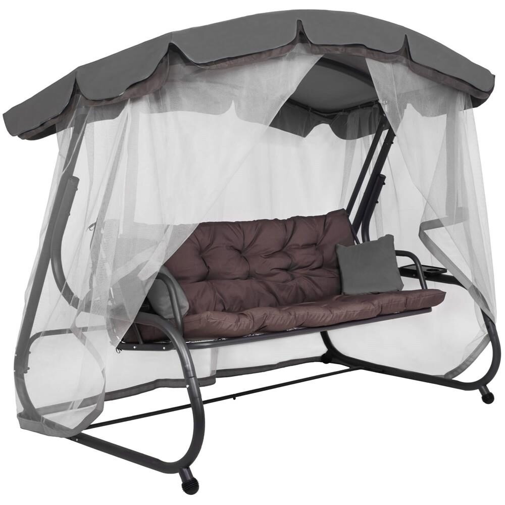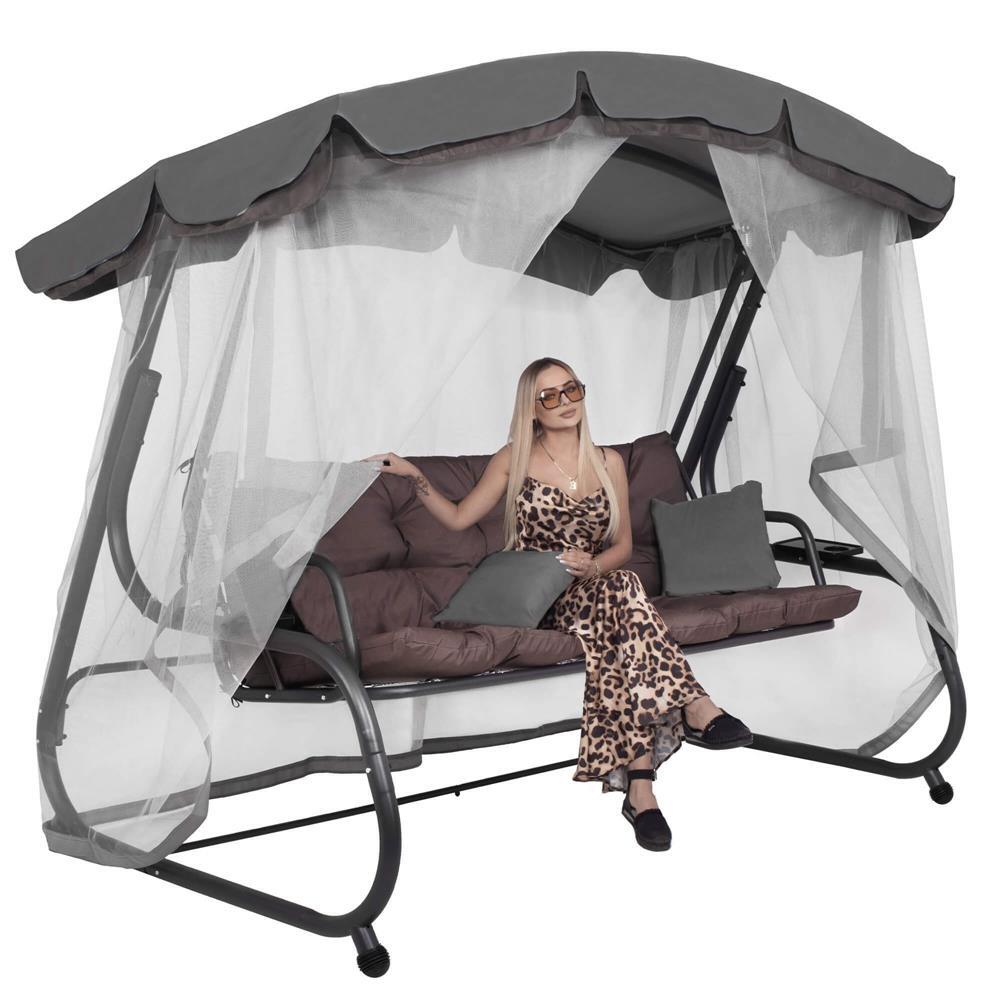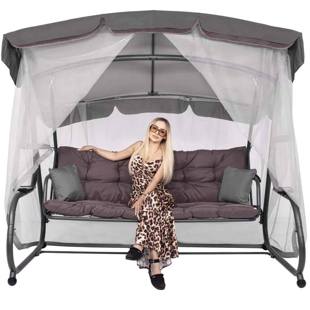 Kerti hinta, Springos, 3 férőhelyes, rovarhálóval, szürke és barna, 226x126x192 cm, ágyfunkciós, párnák, max 260 kg, Diana