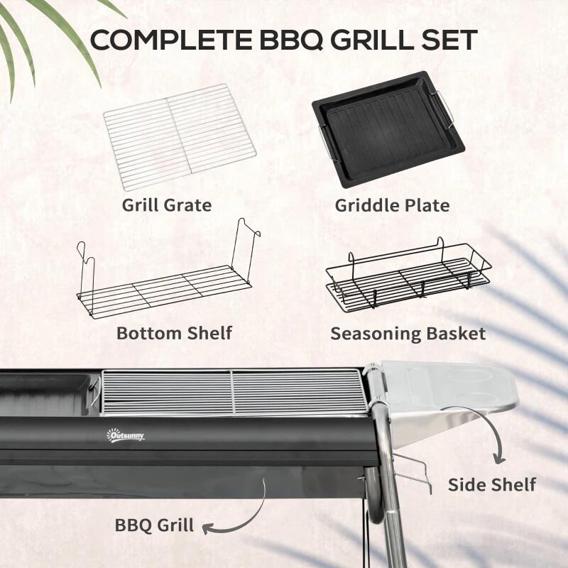 Kerti/kemping faszén grill, hordozható, téglalap alakú grill, polcos, rozsdamentes szerkezet, 96x61x72 cm